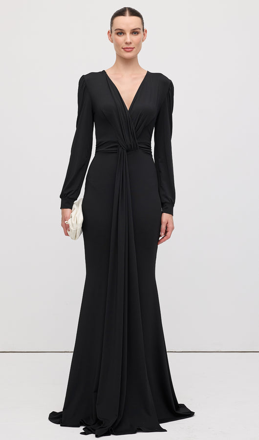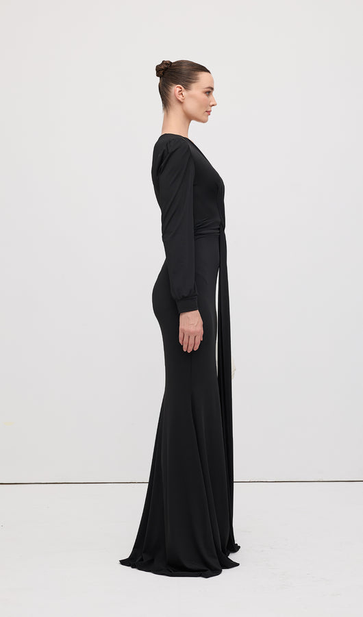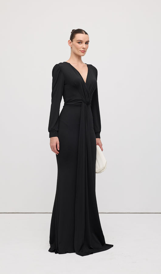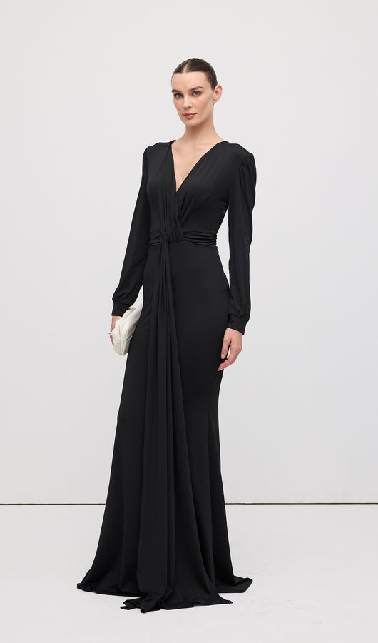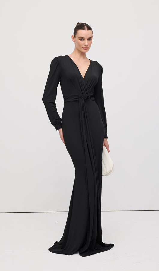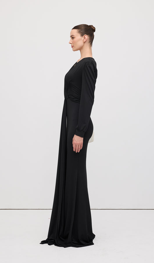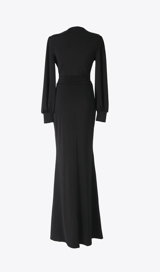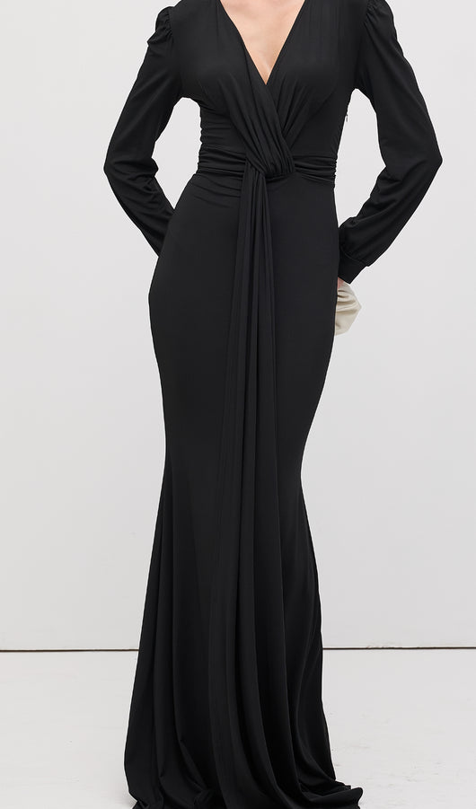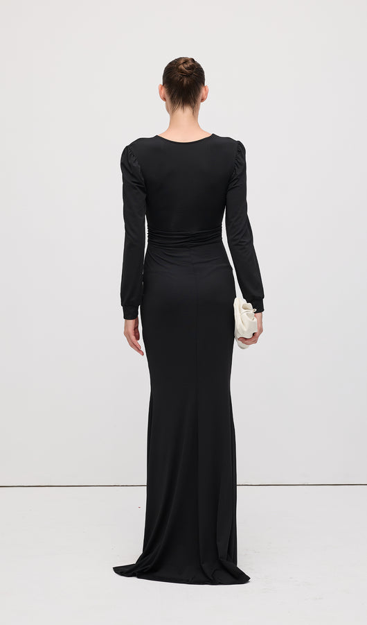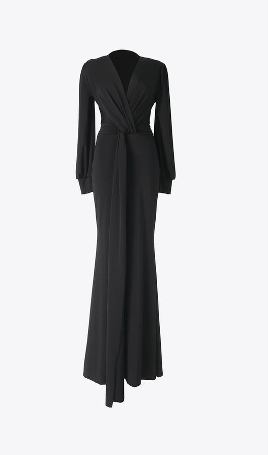 فستان ماكسي أسود بفتحة رقبة على شكل حرف V