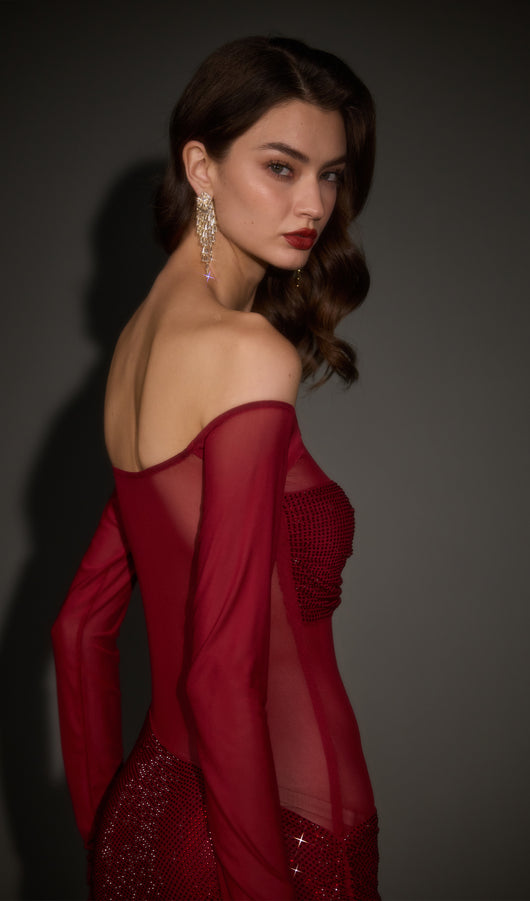 فستان ماكسي مكشوف الأكتاف من ديامانتي هو مزيج مثالي من التألق والرقي. صُمم هذا الفستان بفتحة رقبة باردو جذابة وأكمام طويلة، ويتميز بأناقة لا تنتهي. يخلق النسيج الشبكي تأثيرًا مثيرًا وشفافًا، بينما يضيف الصدر المتباين من ديامانتي لمسة من التألق والفخامة. ترفع تفاصيل اللفة الأمامية من التصميم، وتضفي التنورة المزينة بالديامانتي لمعانًا مذهلاً مع كل خطوة. يعزز خط الخصر غير المتماثل، المقترن بالتجمع عند الورك، منحنياتك الطبيعية. مصنوع من نسيج مطاطي، يوفر هذا الفستان الراحة والأناقة، مما يجعله خيارًا رائعًا لأي مناسبة خاصة.
