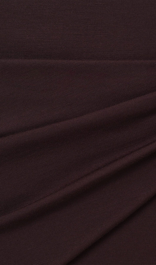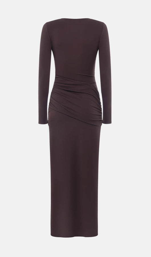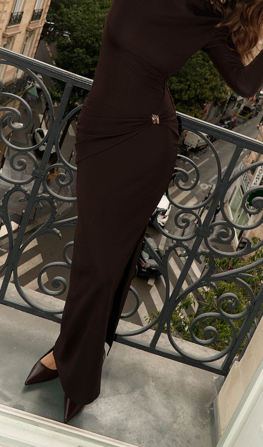 فستان ماكسي جذاب بأكمام طويلة وتنورة مستقيمة. الفستان مصنوع من قماش جيرسي مطاطي ومزين بزخارف معدنية على الكتف والخصر، مما يشكل ثنيات غير متماثلة أصلية ويشكل الصورة الظلية.