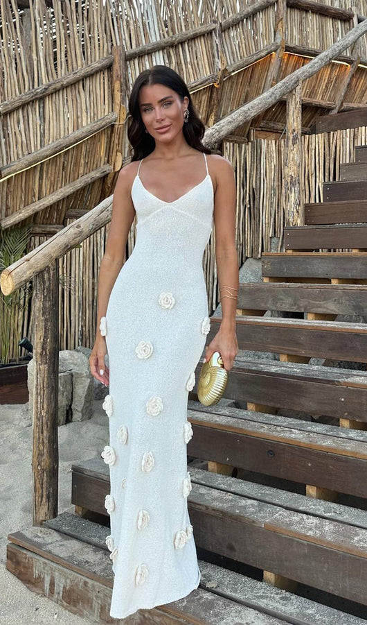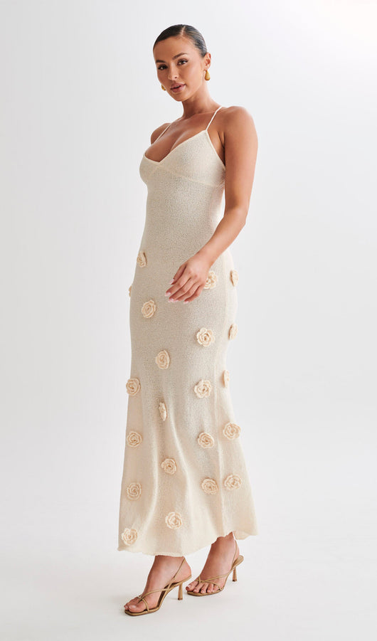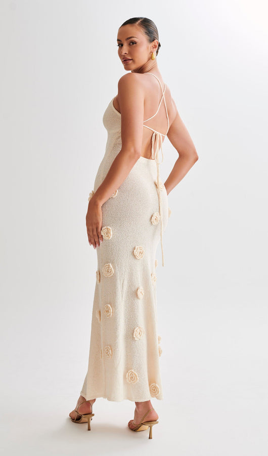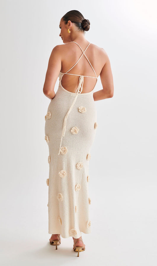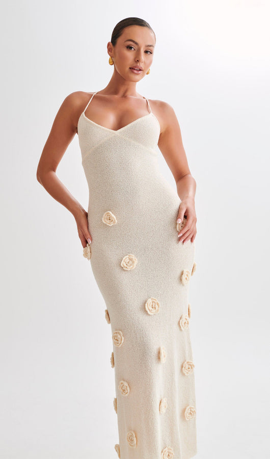 فستان ماكسي محبوك مع زهور - أبيض عاجي