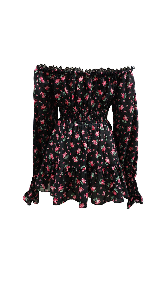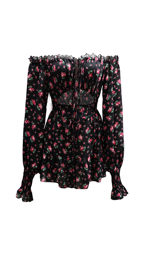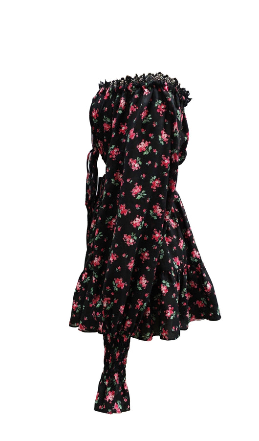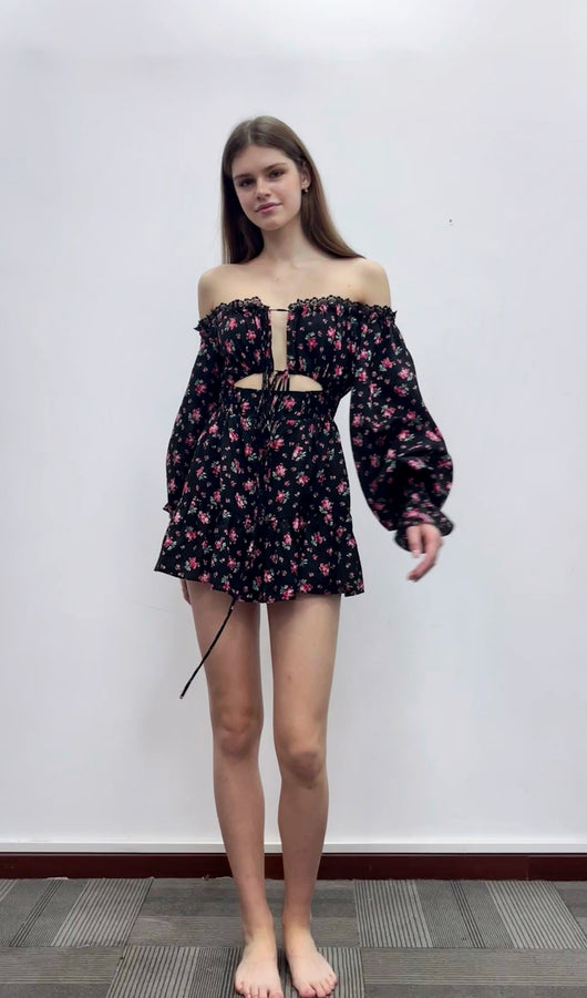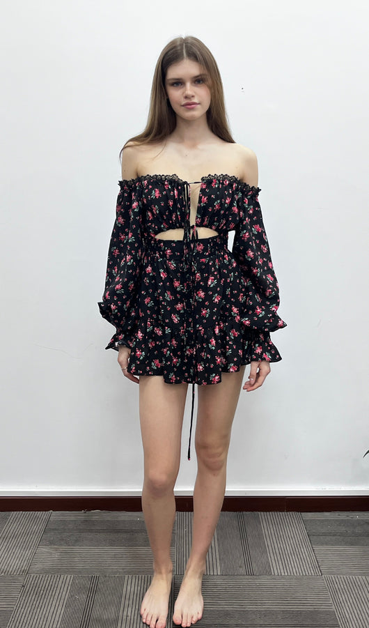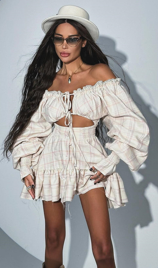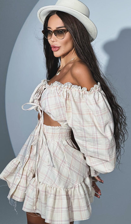 طقم فستان قصير من قطعتين بأربطة، يتميز بتصميم عصري بأربطة وأكمام منفوخة جذابة وتفاصيل كشكشة رقيقة. مثالي لأي مناسبة.