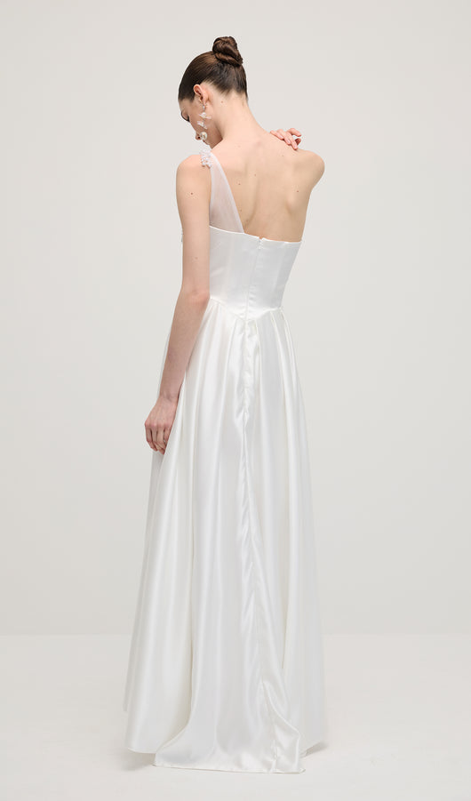 فستان طويل بقصّة ضيقة، مفتوح الظهر، وحمالات رفيعة قابلة للفصل والتعديل، وتفاصيل مدببة عند الصدر. إغلاق خلفي بحمالة صدر.
