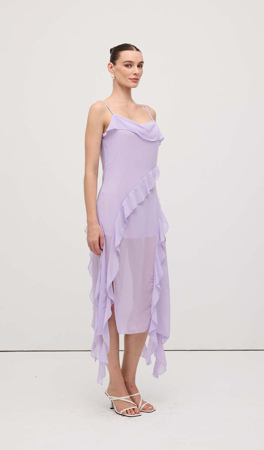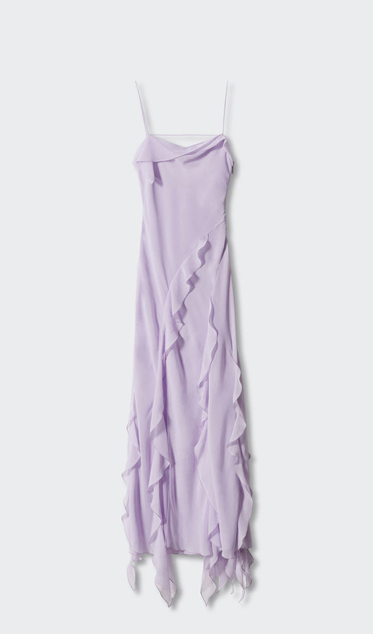 فستان ماكسي أنيق بكتف واحد ومكشكش، مصنوع من حرير جورجيت ناعم وفاخر. يُضفي الصدر غير المتماثل والكشكشة الرقيقة لمسة من الرقي، بينما تُضفي تفاصيل الفتحة والوردة المزخرفة يدويًا لمسةً مميزة. مثالي لأي مناسبة خاصة.