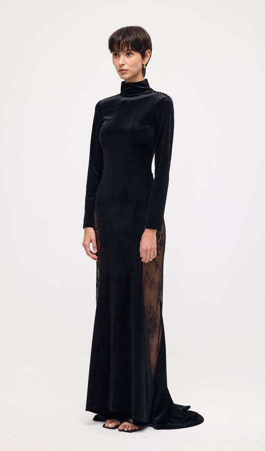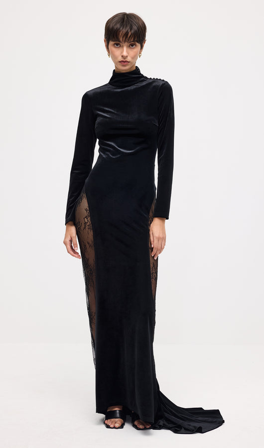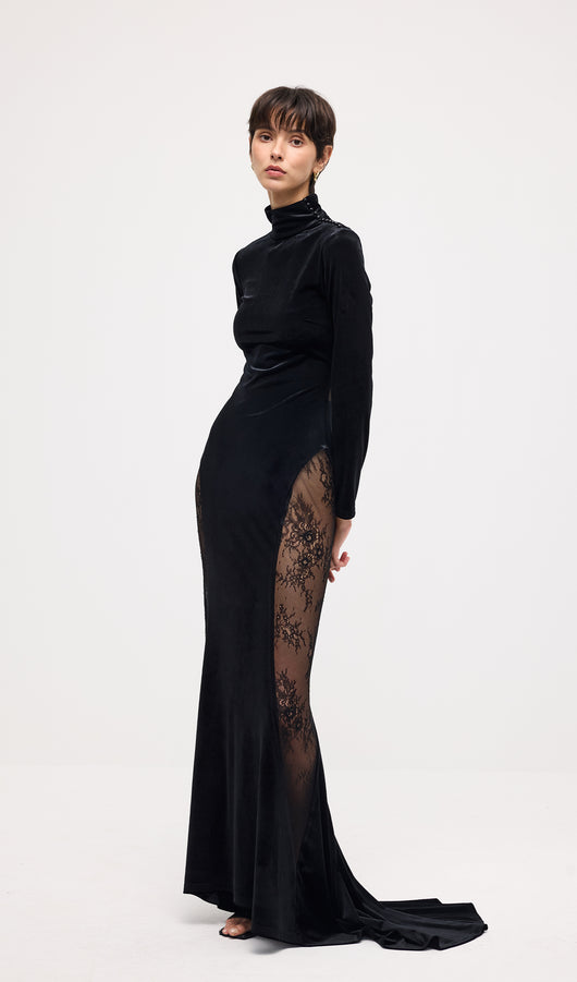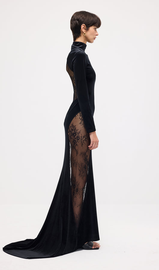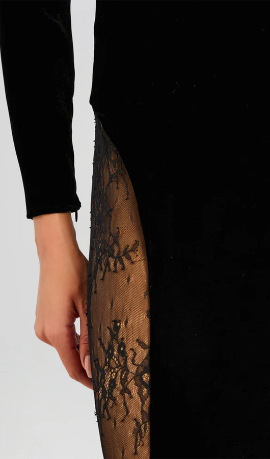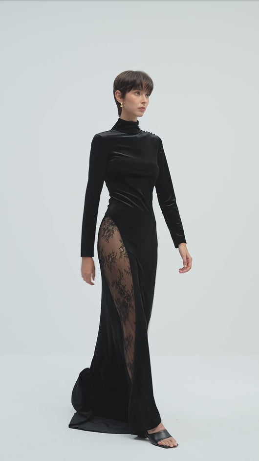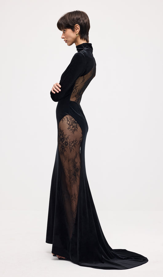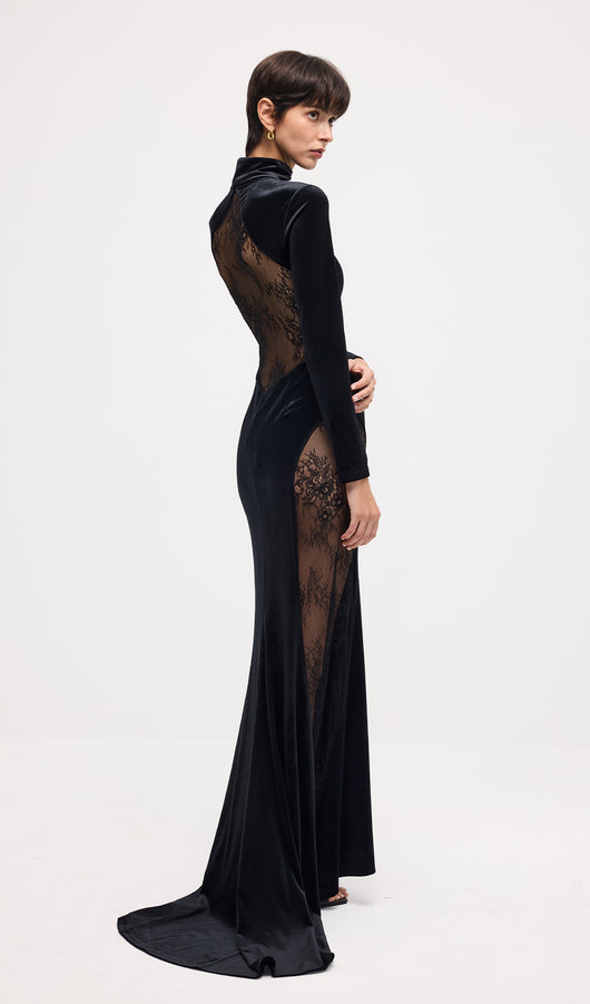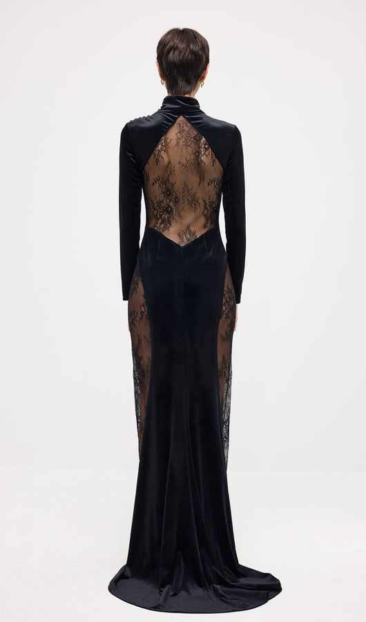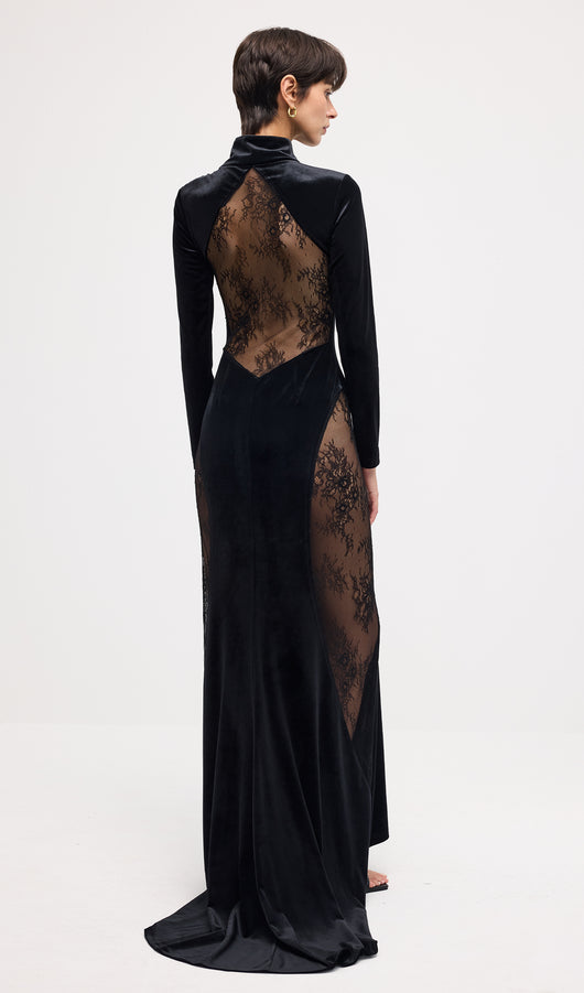 فستان ماكسي مخملي من الدانتيل شبه الشفاف