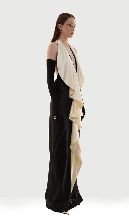 فستان قصير بقصّة شبه ضيقة، مصنوع من مزيج من مادتين بأسلوب عملي. يتميز بياقة قميص وتنورة مطوية أنيقة مصنوعة من قطن كثيف، بالإضافة إلى سترة محبوكة بأكمام طويلة وتطريز من الدانتيل على الأكمام والحافة السفلية.