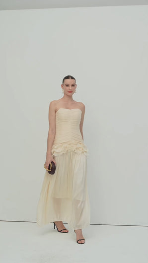 يتميز هذا الفستان بفتحة رقبة واسعة وتصميم داخلي بدون حمالات مع طبقة شبكية أنيقة، ليجمع بسلاسة بين الأناقة والجاذبية. تُضفي الكشكشة عند الخصر من الأمام والخلف لمسةً من الأناقة على إطلالتكِ، مما يضمن لكِ إطلالةً أنيقة ومريحة. تُضفي التنورة الشبكية المنسدلة سحرًا خلابًا، بينما يوفر الصدر المبطن الراحة والتغطية. مثالي للمناسبات الرسمية أو الخاصة، يتميز هذا الفستان بطوله الطويل الذي يُضفي عليه لمسةً من الأناقة والرقي، مما يجعله خيارًا مثاليًا لأمسيات ساحرة.