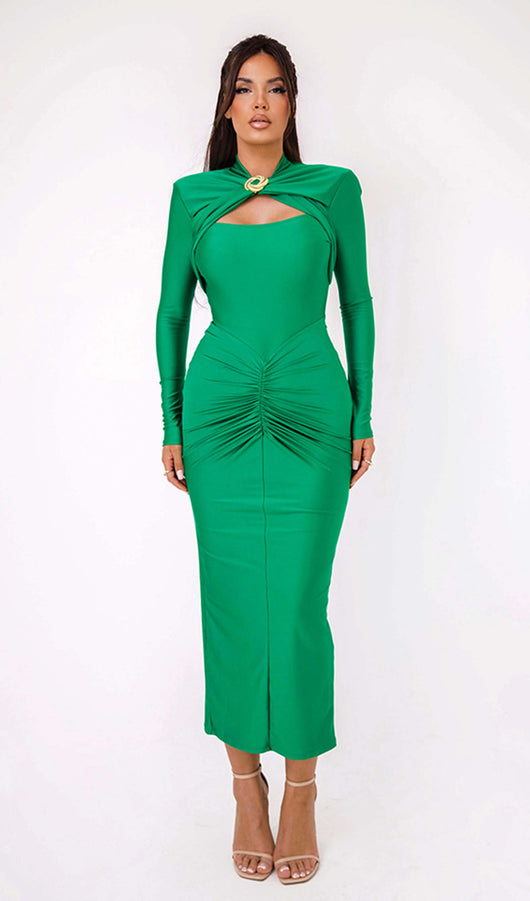 يذكرنا الفستان بالأنماط العتيقة الرائعة بظله الجميل وتصميمه المكشكش الجذاب. إنه مفصل بلمسات مبهجة للغاية ليجعلك تشعرين بالأناقة والجاذبية في تلك المناسبات الخاصة. تجمعات الورك الموضوعة بشكل مثالي لتشد قوامك والجزء الأمامي المرح على شكل شلال محاط بأجمل الكشكشة. يمتد الحاشية المنسدلة إلى ذيل في الخلف ليتدلى بشكل جميل خلفك أثناء المشي. يتم سحّابه إلى الخلف لسهولة الارتداء ويبدو أنثويًا للغاية مع الكعب العالي الذي يرتفع من أسفل الحاشية أثناء المشي.