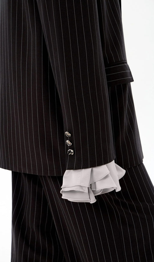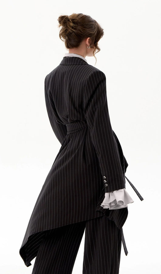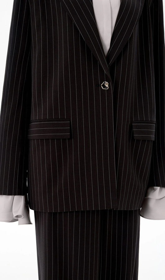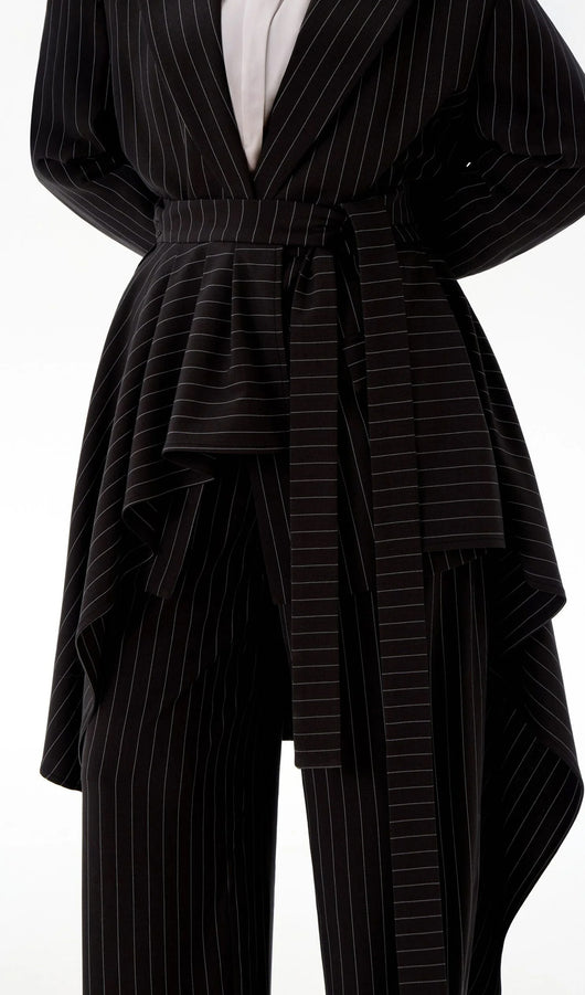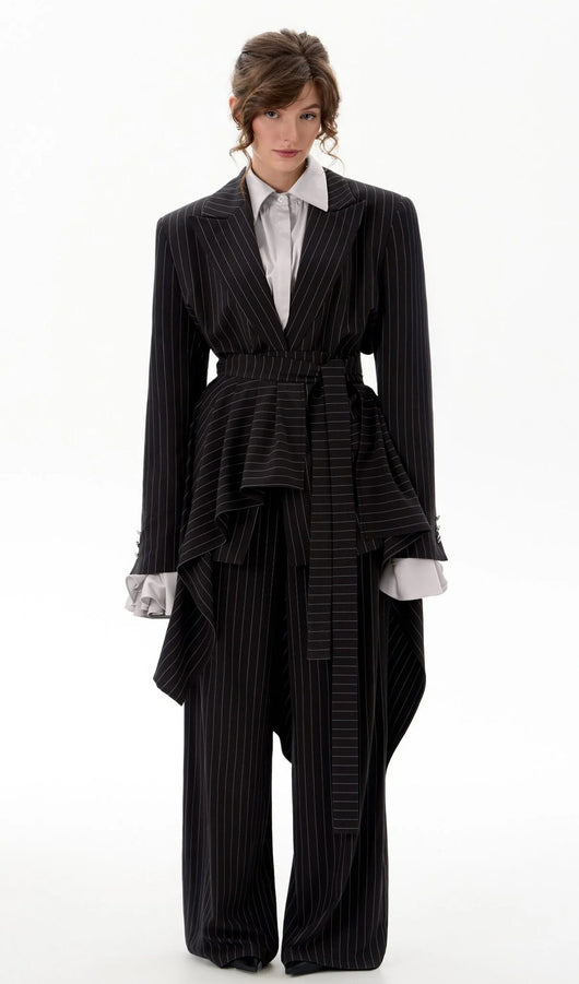 فستان قصير بقصّة شبه ضيقة، مصنوع من مزيج من مادتين بأسلوب عملي. يتميز بياقة قميص وتنورة مطوية أنيقة مصنوعة من قطن كثيف، بالإضافة إلى سترة محبوكة بأكمام طويلة وتطريز من الدانتيل على الأكمام والحافة السفلية.