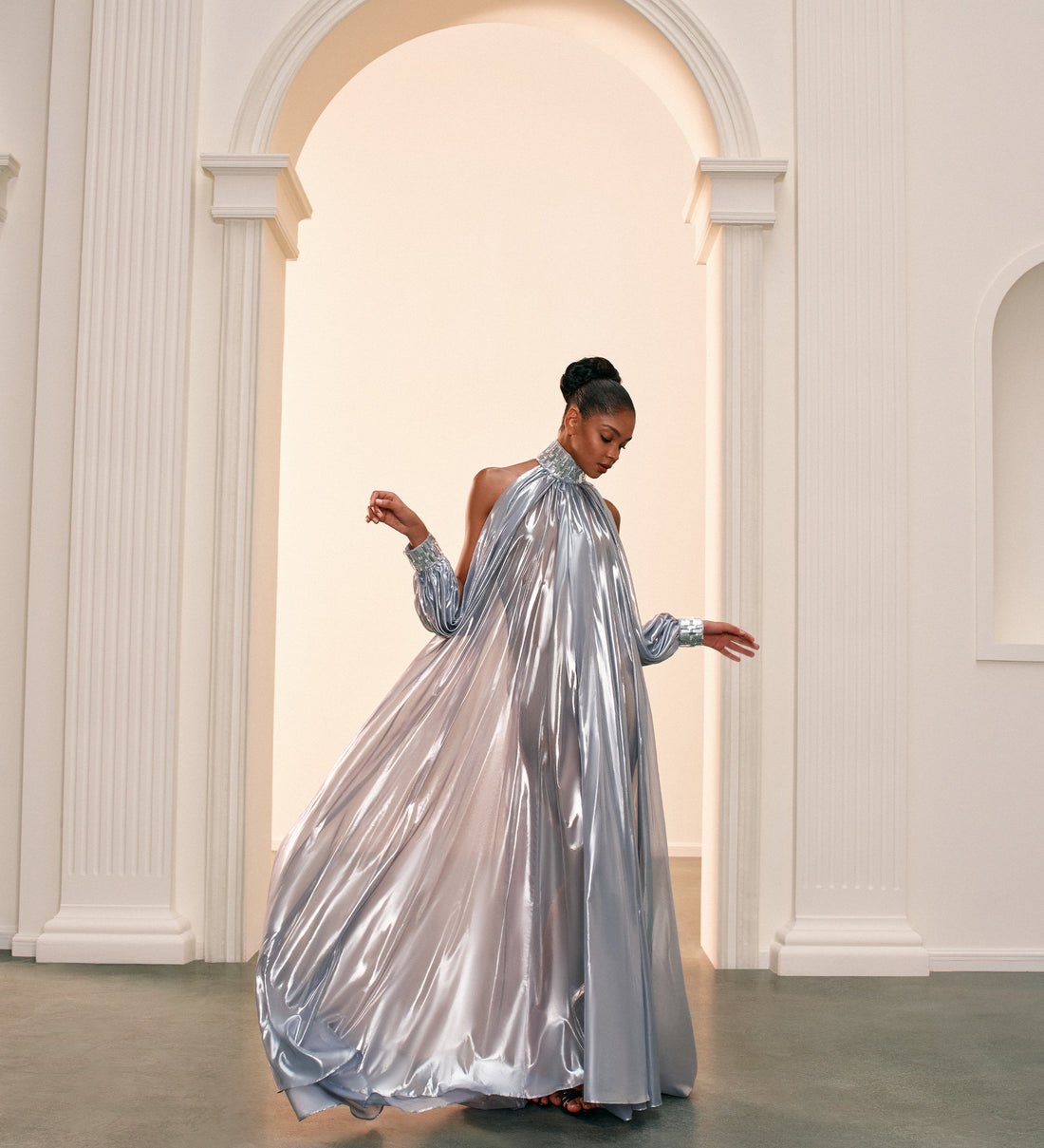 Lace Trimmed Puff Sleeve Silk Maxi Dress