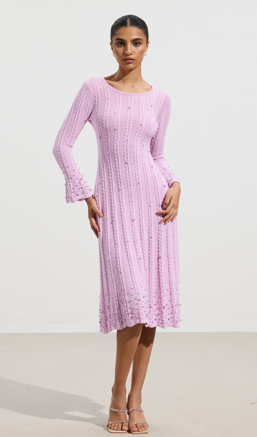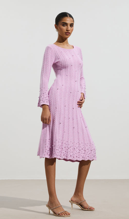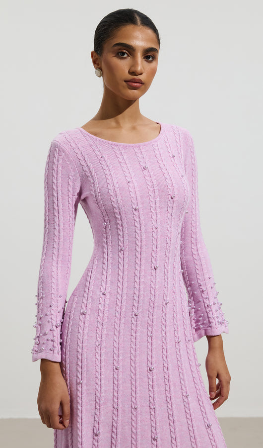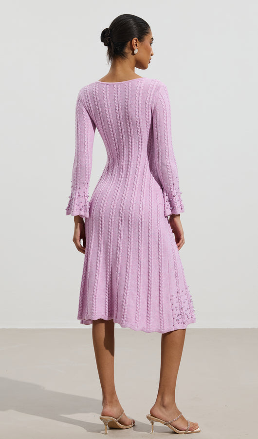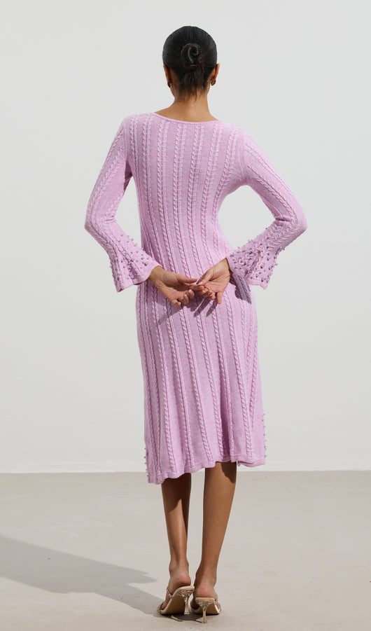 Beaded Bell Sleeve Cable Knit Midi Dress In Purple