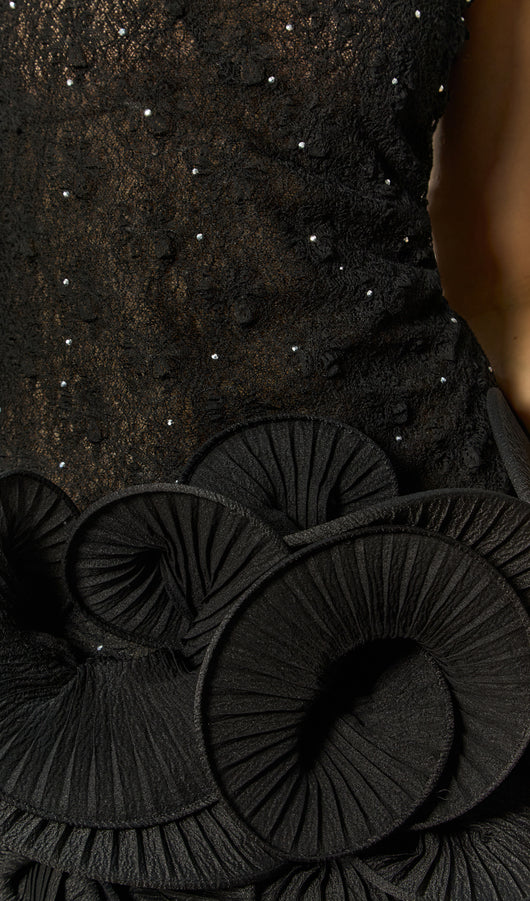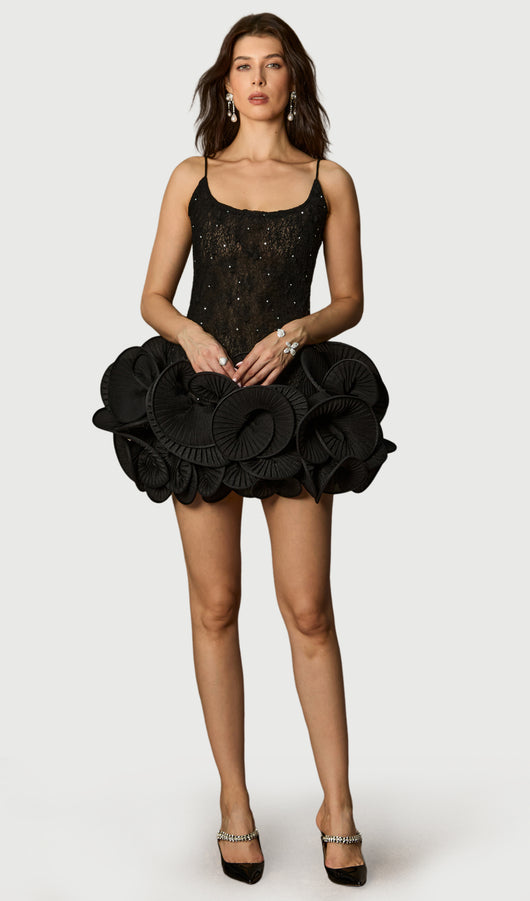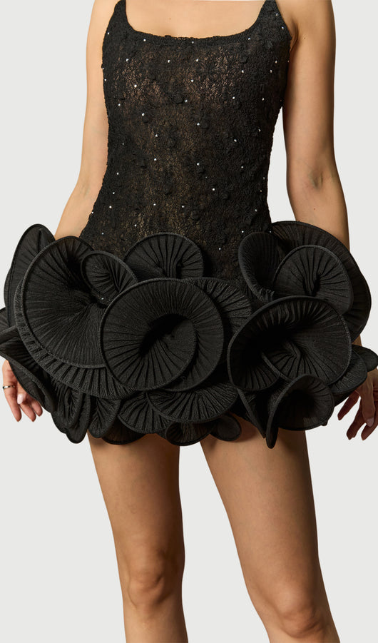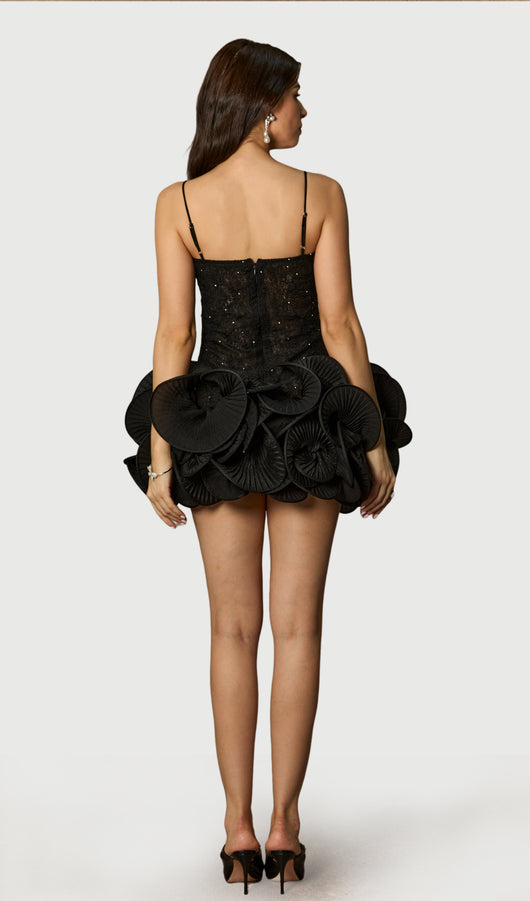 Elevate your evening repertoire with this sophisticated black mini dress, where intricate 3D floral embellishments meet delicate lace construction. The dimensional floral details create striking visual depth and texture, transforming a classic silhouette into a statement piece. The lace foundation provides refined coverage while maintaining an elegant, breathable quality. Perfect for cocktail events, upscale dinners, or occasions demanding polished sophistication. The mini length offers contemporary appeal without compromising the dress's inherent elegance. A versatile investment that transitions seamlessly from season to season, this dress pairs effortlessly with heels or strappy sandals for an impeccable finish.