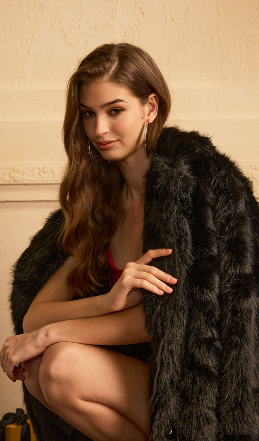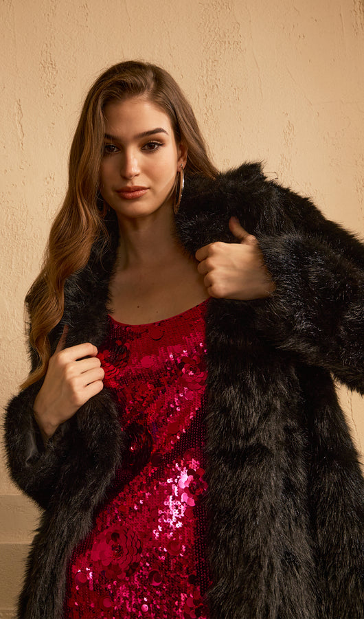 Elegant loose-fitting maxi coat with a voluminous collar and comfortable sleeves, made from warm faux fur with a lush pile.