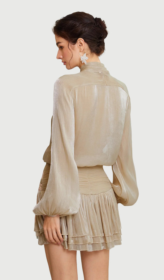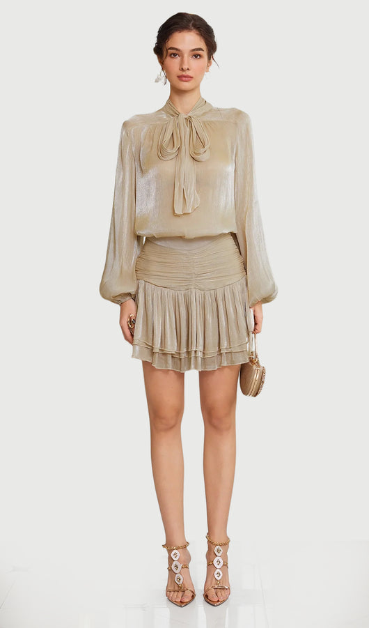 This two-piece commuting set blends modern elegance with soft texture and everyday comfort. The lightweight tie-neck top adds a refined touch, while the ruffled mini dress provides a leg-lengthening and polished silhouette. Ideal as a versatile office outfit, this layered look gives structure and movement with subtle pleated details, making it perfect for daily commuting and chic city style.