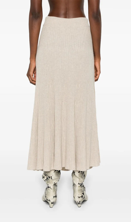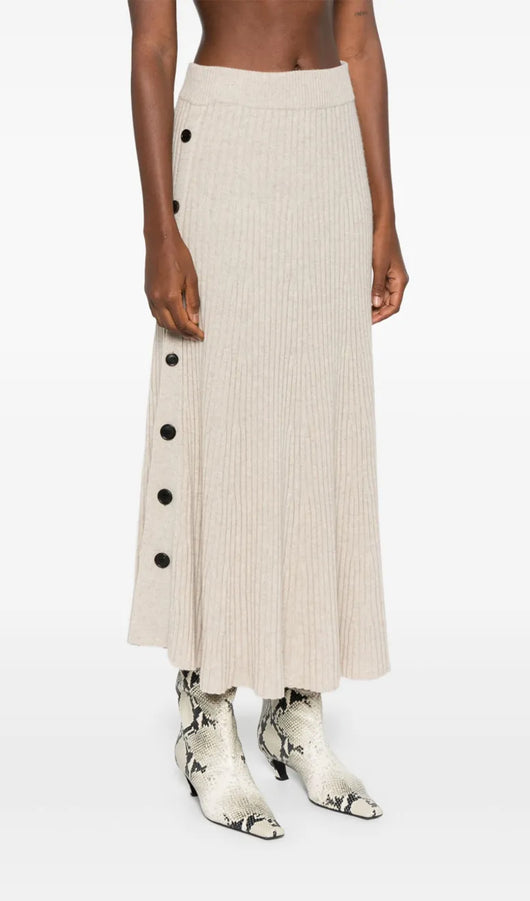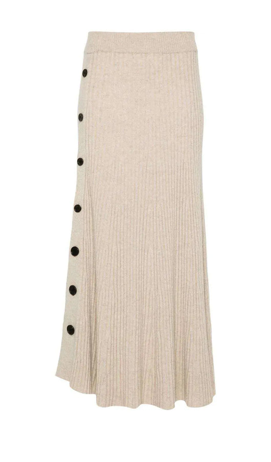 Elevate your wardrobe with this sophisticated ribbed maxi skirt, designed for refined elegance. The distinctive button detailing along the side creates a striking visual element, while the side button fastening offers both style and practicality. Crafted with a straight hem and mid-length cut, this piece delivers a polished silhouette that transitions seamlessly from day to evening. The ribbed texture adds subtle dimension and movement, making it a versatile foundation for countless styling possibilities.