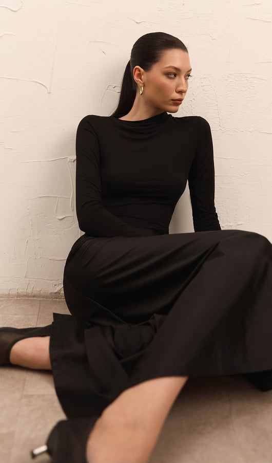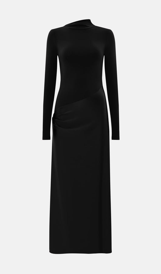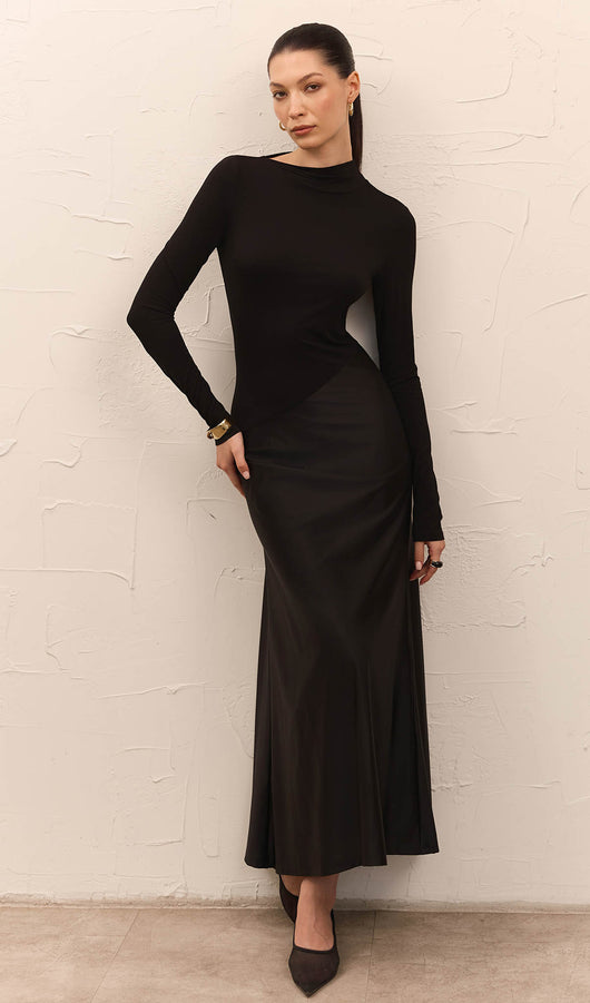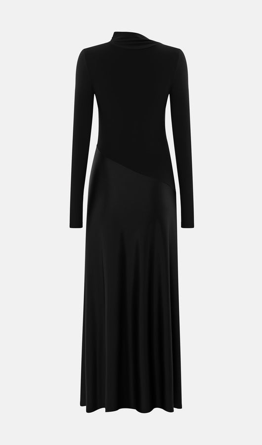 Elegant fitted maxi dress, made from a combination of stretchy viscose-based jersey and flowing satin. The dress has an asymmetrical neckline and fitted long sleeves, as well as a slightly flared skirt.