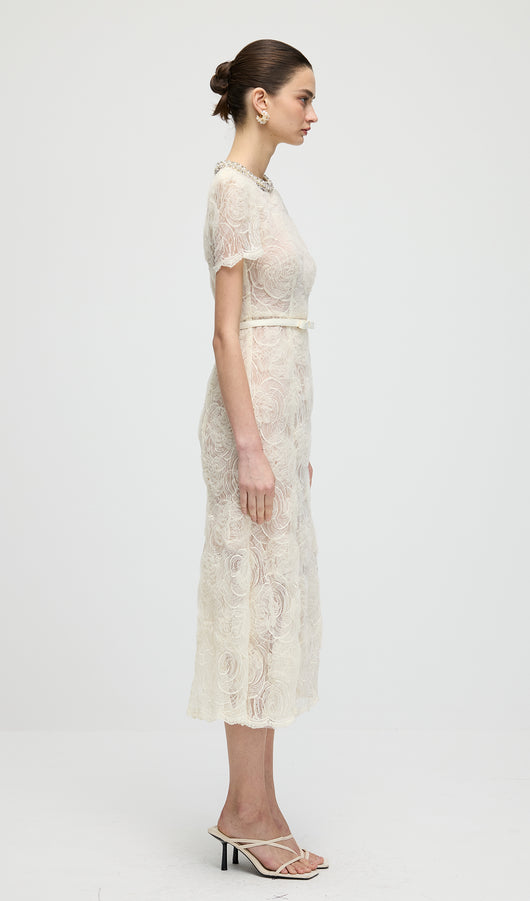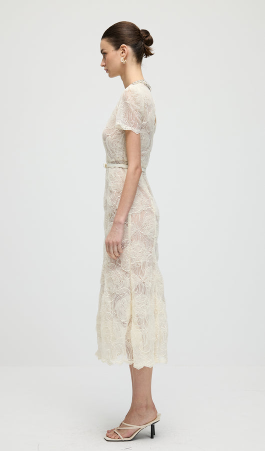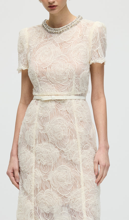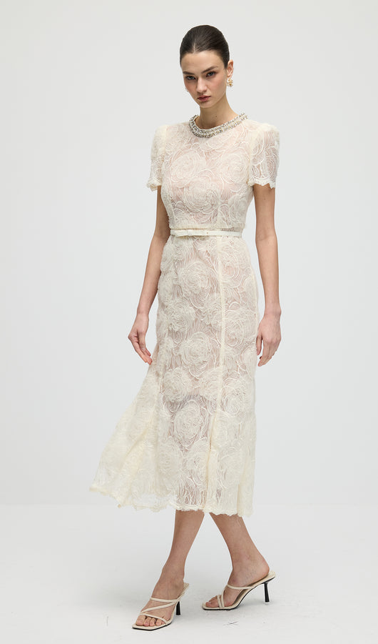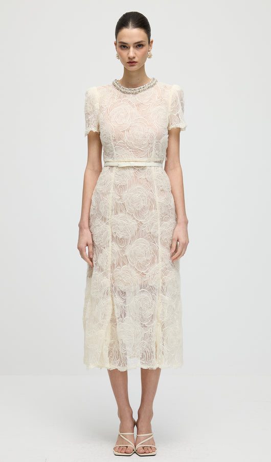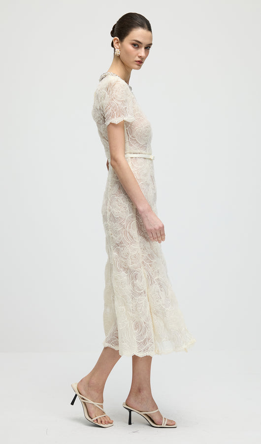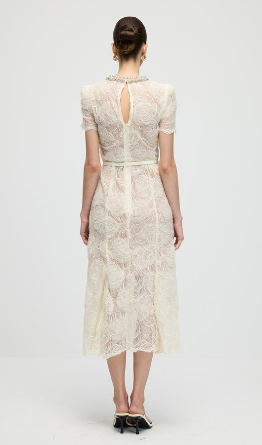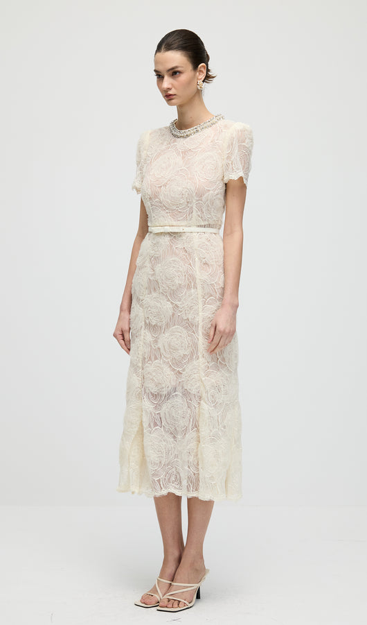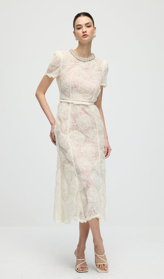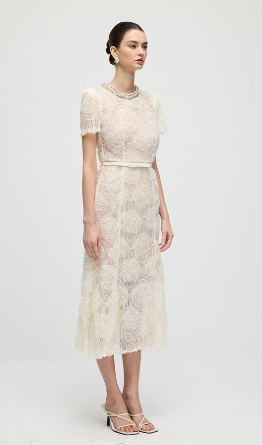 Cream Tulle Lace Midi Dress