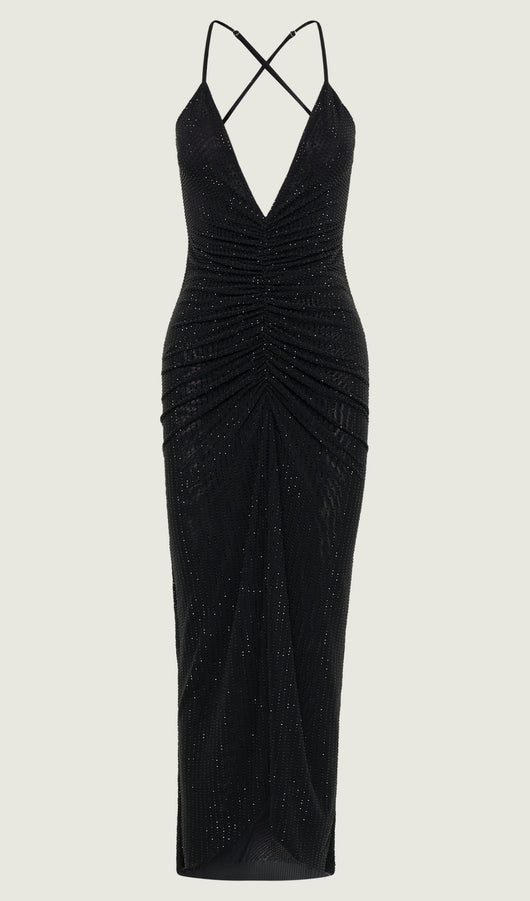 Diamante Ruched Midi Dress - Black