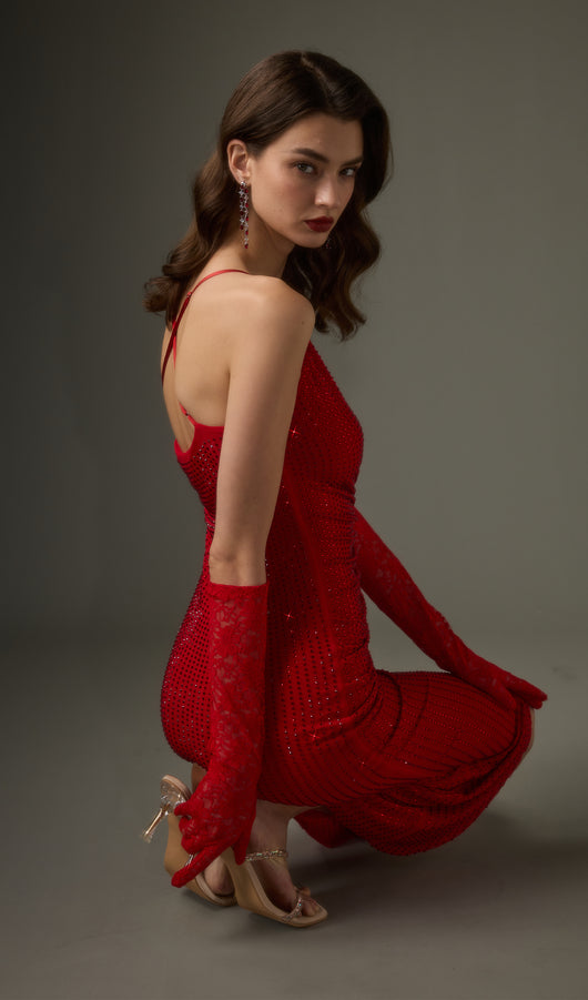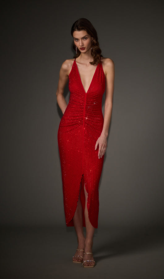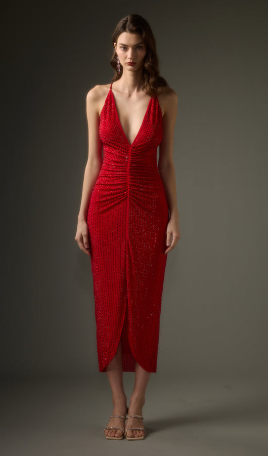 Diamante Ruched Midi Dress In Red