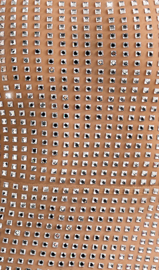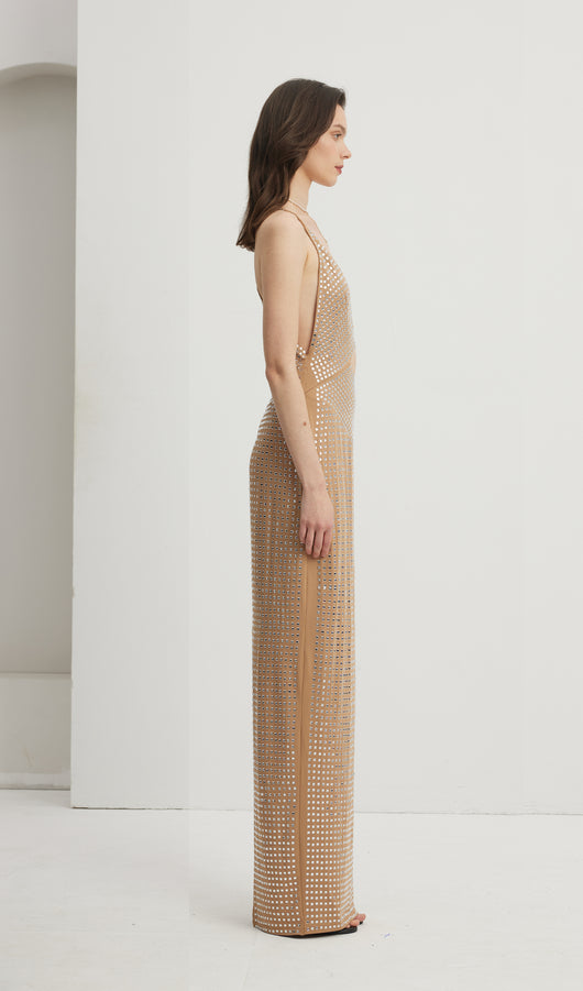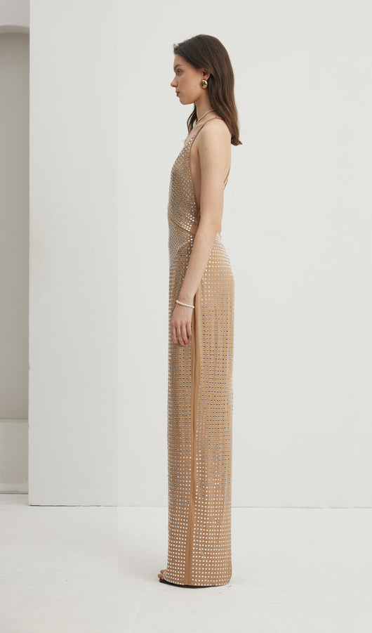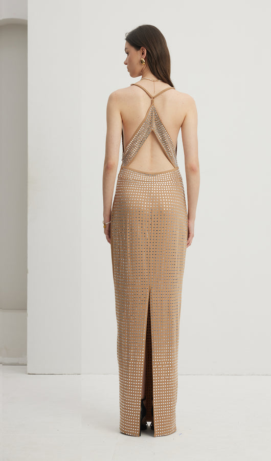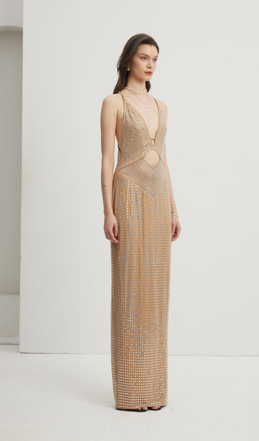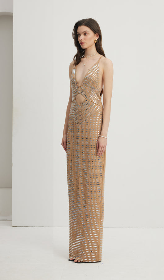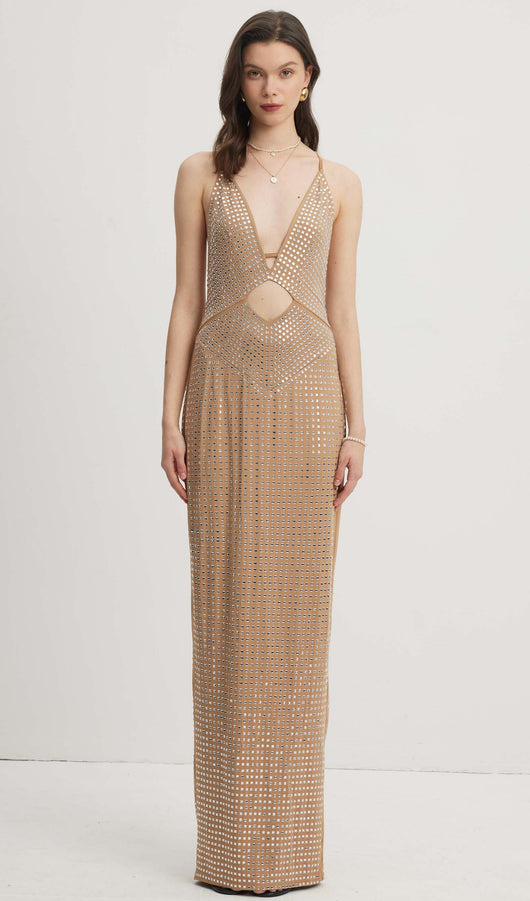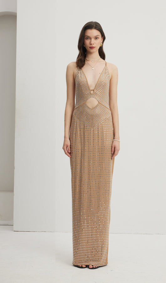 Unique silhouettes for maximum impact. Statement eveningwear is our forte and the maxi dress is proof: it’s crafted from premium 20D mesh to a sculpting bodycon silhouette, underlaid with a lightweight single-layer lining, and adorned with scores of hand-embellished HOTFIX crystals that provide endless sparkle. The plunging neckline and triangle cut-out are mirrored at the back for a striking finish.