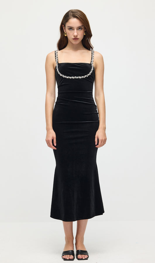 Elevate your evening wardrobe with this sophisticated sleeveless velvet midi dress in classic black. The luxurious velvet fabric drapes beautifully, creating an elegant silhouette that transitions seamlessly from cocktail events to formal gatherings. Intricate embellishments add refined detail and visual interest, while the midi length offers timeless versatility. The sleeveless design showcases the shoulders and pairs effortlessly with statement jewelry or a structured blazer. Perfect for those seeking understated luxury with a touch of glamour.
