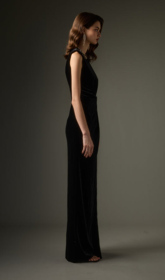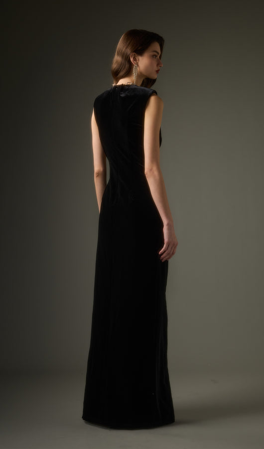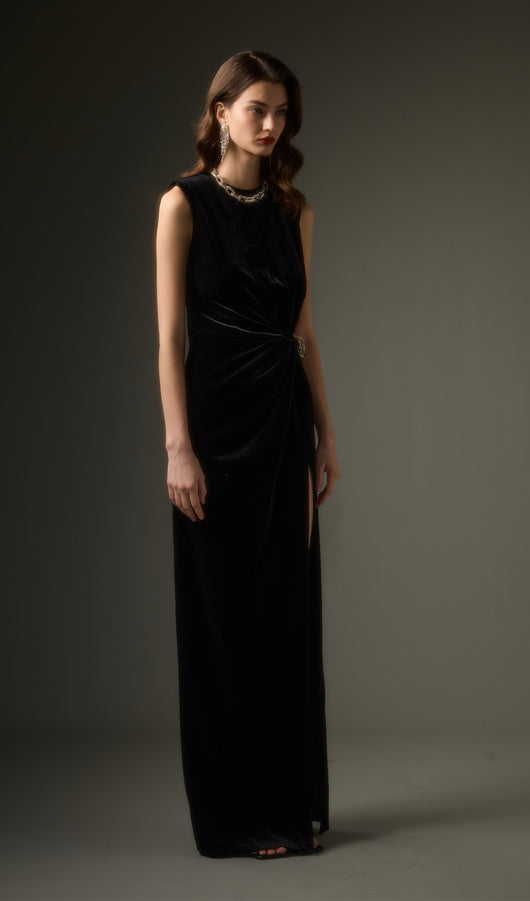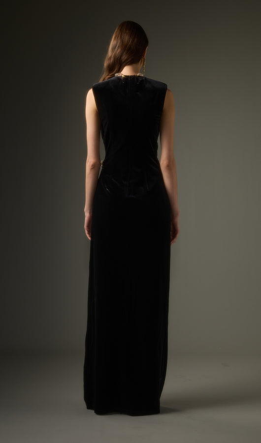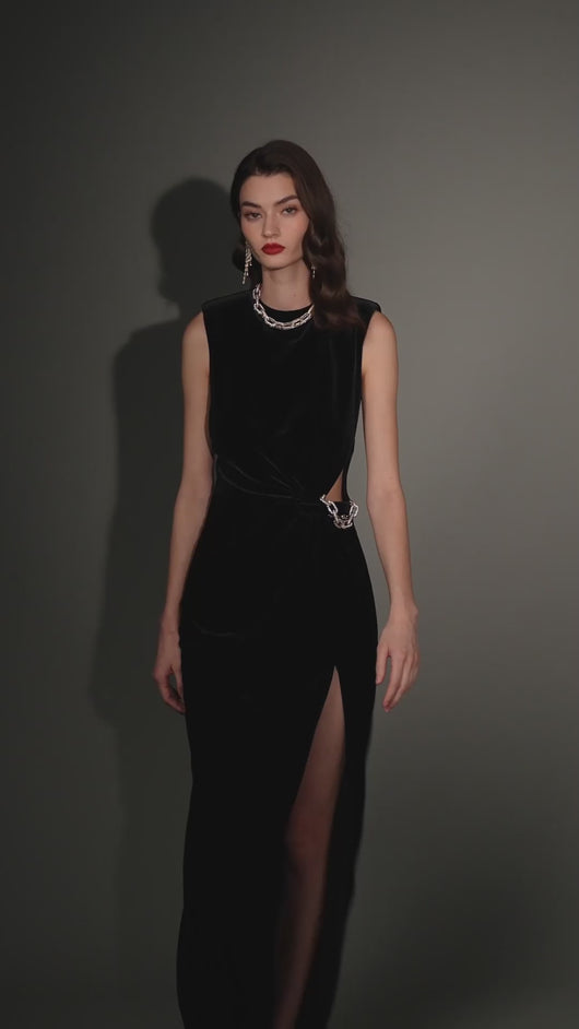 Designed for drama, this dress is cut from black velvet for a lush after-dark palette.ide cut-out detail with pearls. Zip closure at the back and back slit. Its waist-cinching cut-out, embellished chain accent and striking side split will help you work your angles.