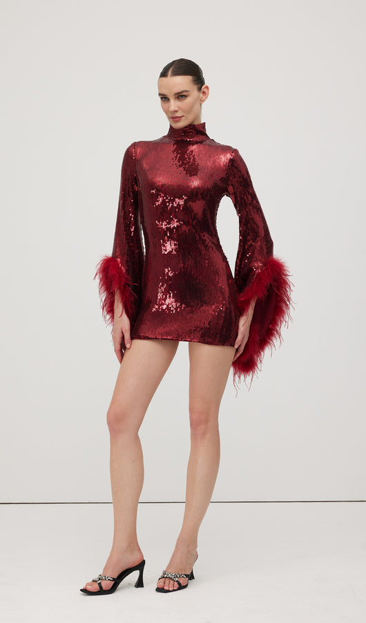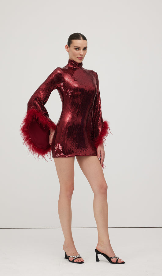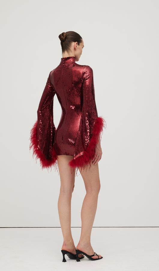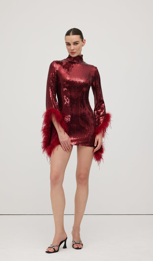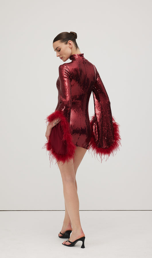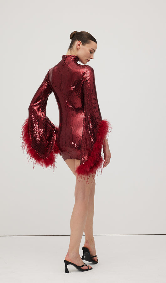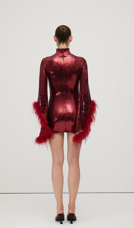 This Feather-Trimmed Sequined Mini Dress adds a touch of glamour to any occasion. The sequin detailing catches the light perfectly while the feather trim adds a playful element. Made with high-quality materials, this dress is both stylish and comfortable. Perfect for standing out in a crowd and making a statement.