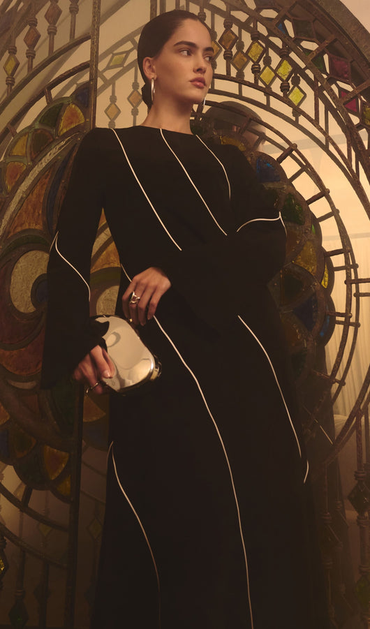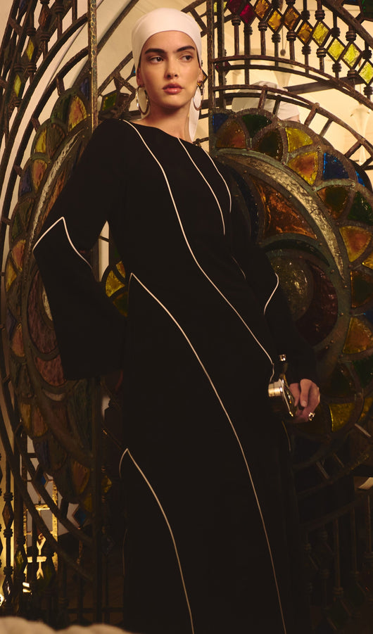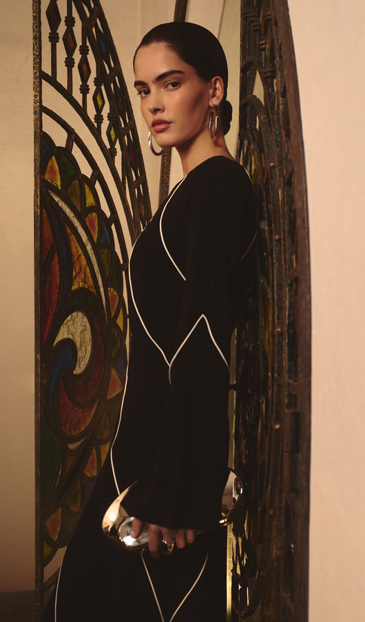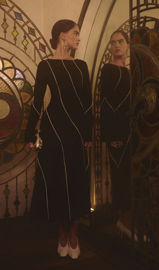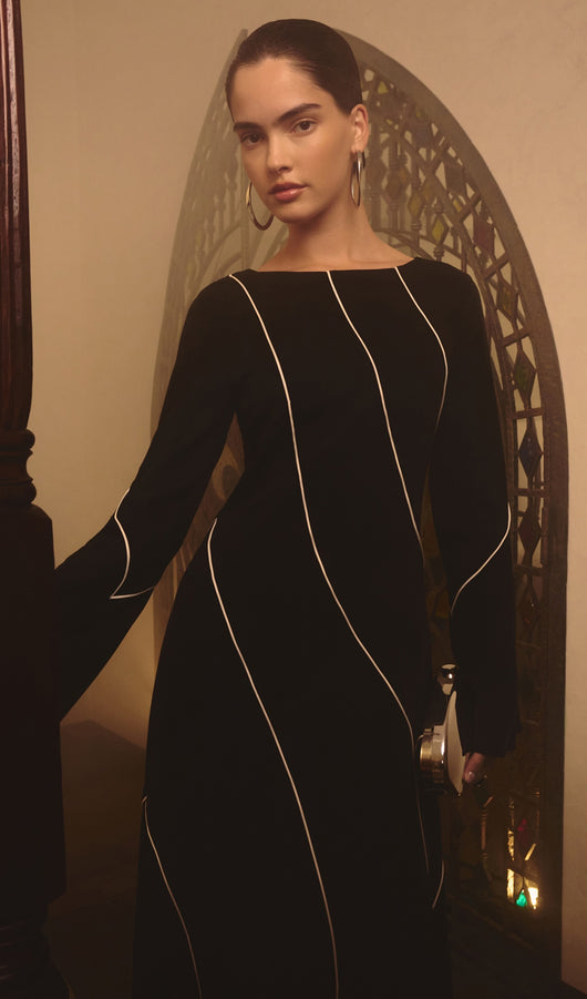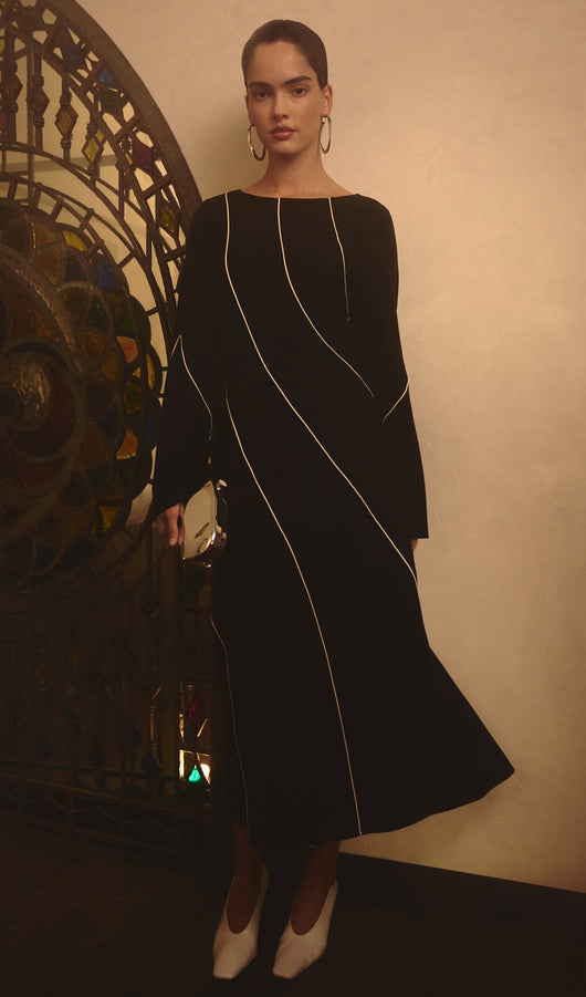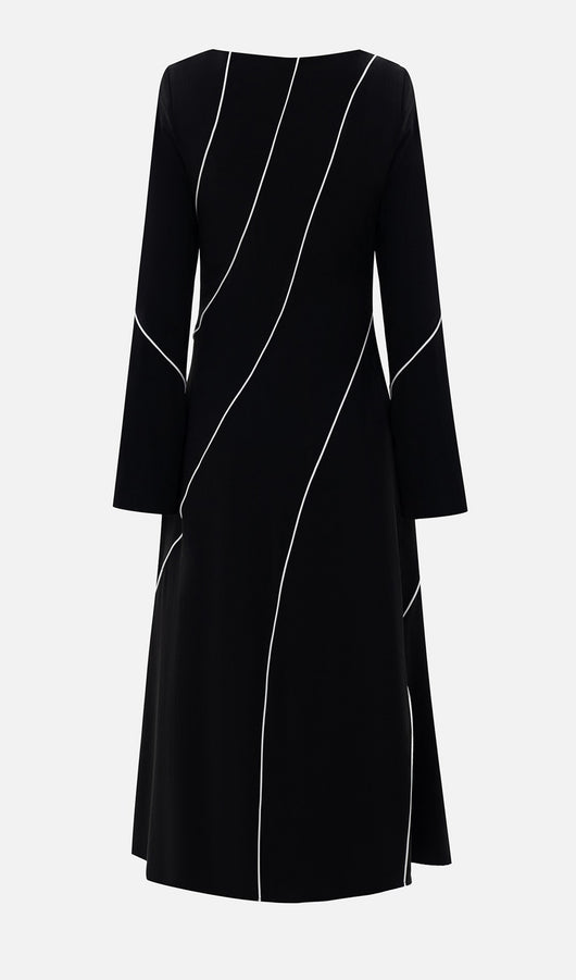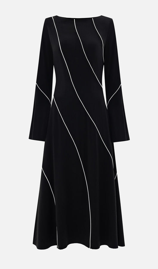 A discreet, fitted midi dress with a delicate scoop neckline, long sleeves, and a flowing flared skirt, crafted from a comfortable viscose fabric with a contrasting pattern.