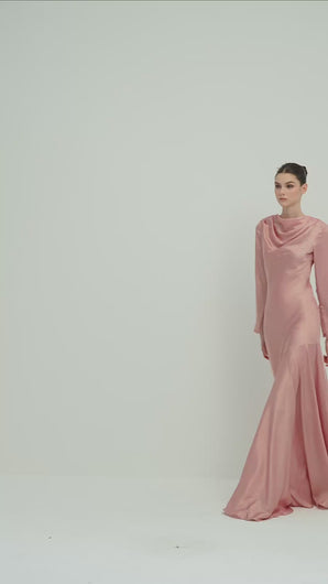 Semi-fitted silhouette maxi dress made from monochrome satin with delicate rhinestone decoration. The model has a fitted bodice with a draped neckline and pleats on the shoulders, as well as straight long sleeves and flared skirt with a voluminous flounce.