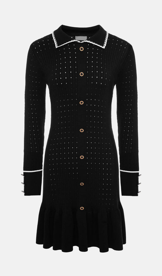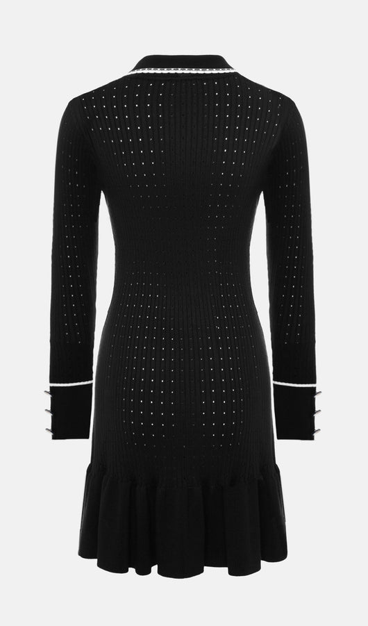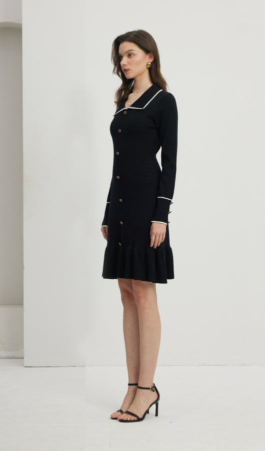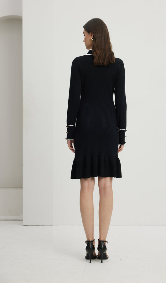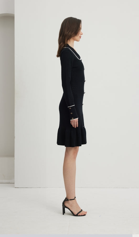 Elegant mini dress with a triangular turn-down collar, fitted long sleeves and a playful skirt with a wide flounce. The dress is made of body-friendly knitted fabric, with contrast edging on the collar and cuffs and a decorative row of vintage-inspired buttons.