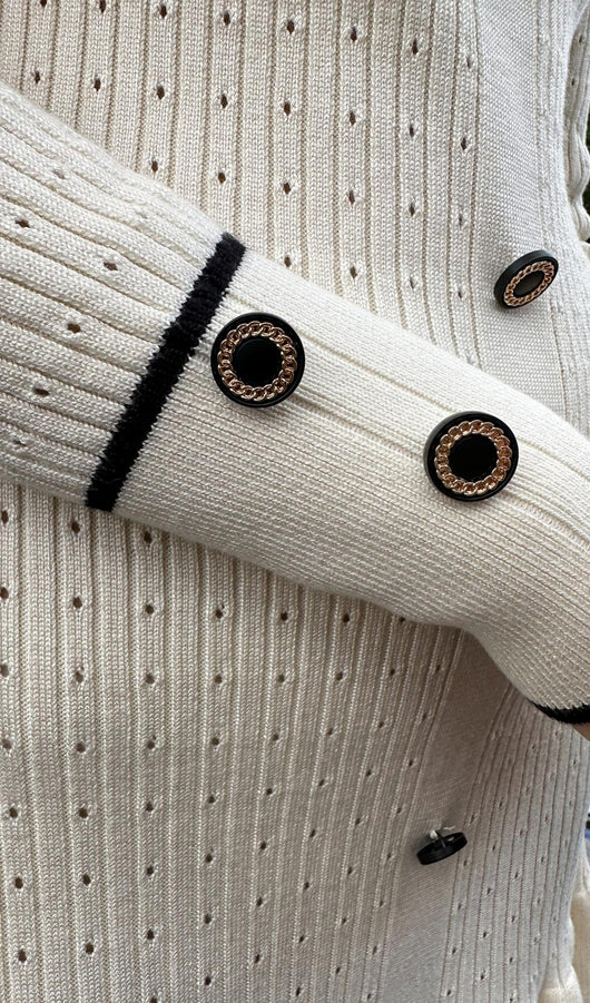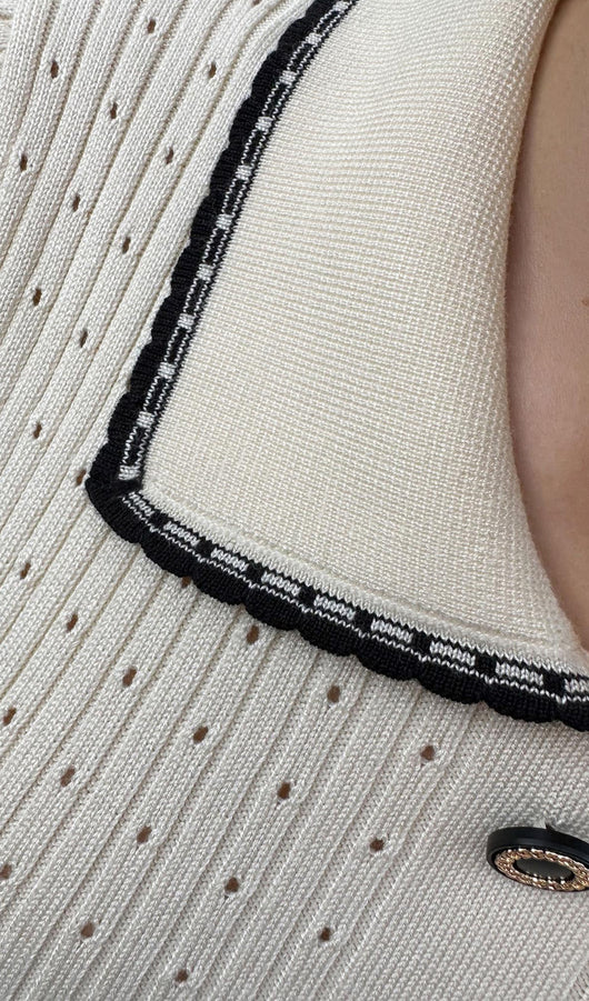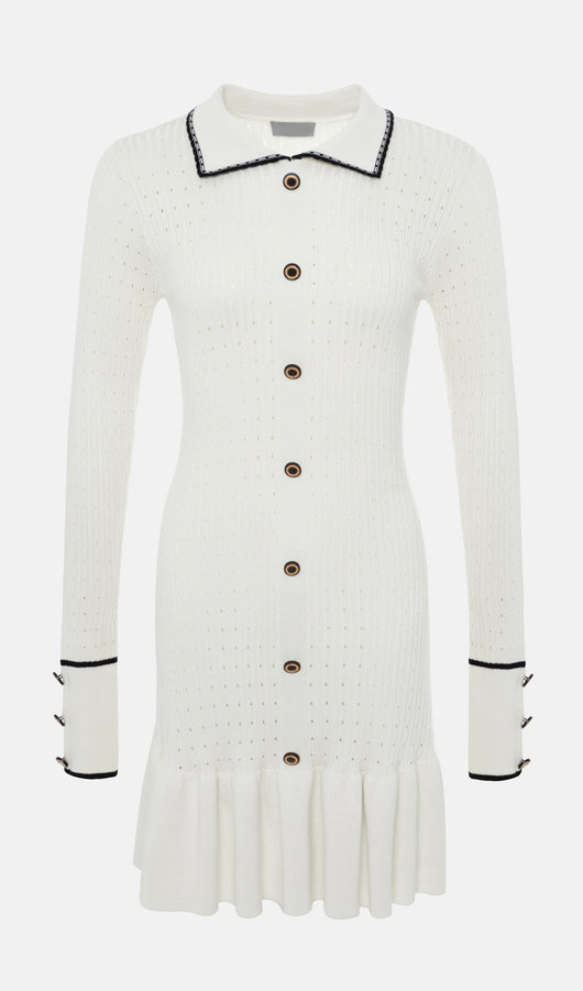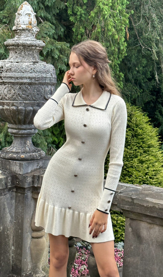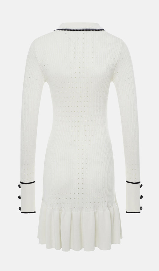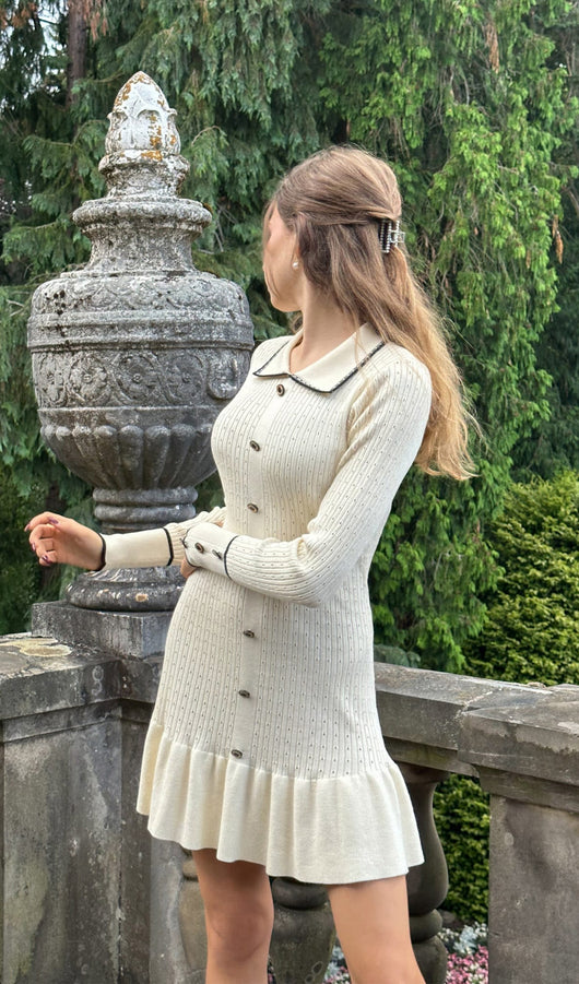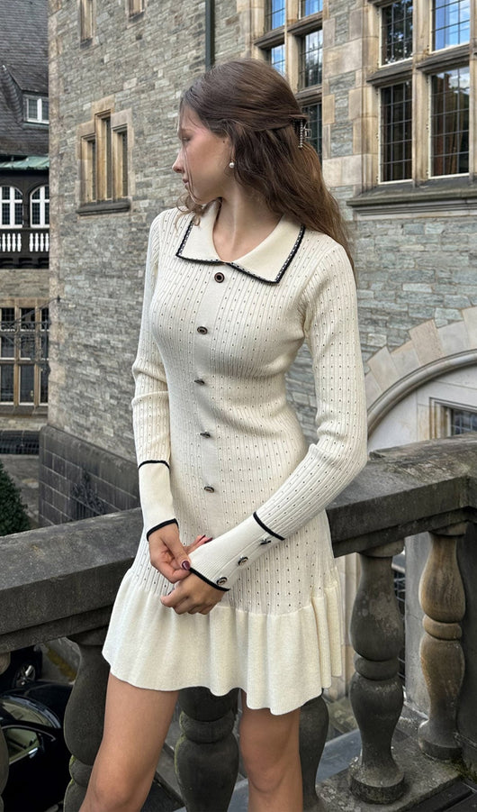 Elegant mini dress with a triangular turn-down collar, fitted long sleeves and a playful skirt with a wide flounce. The dress is made of body-friendly knitted fabric, with contrast edging on the collar and cuffs and a decorative row of vintage-inspired buttons.