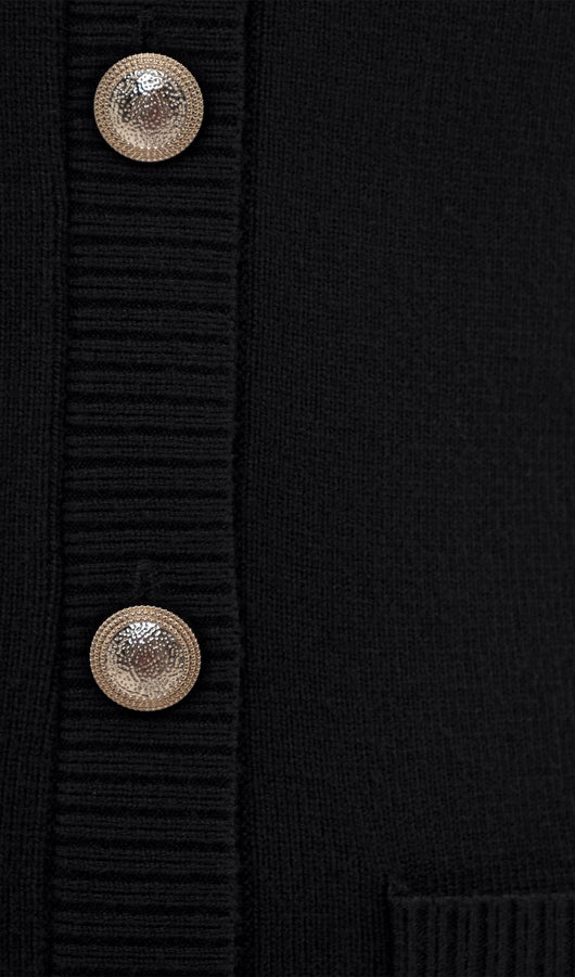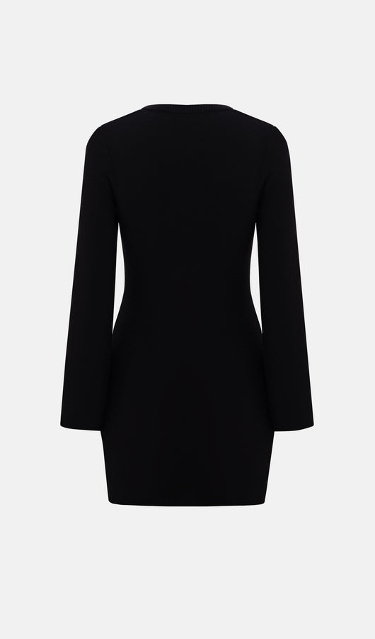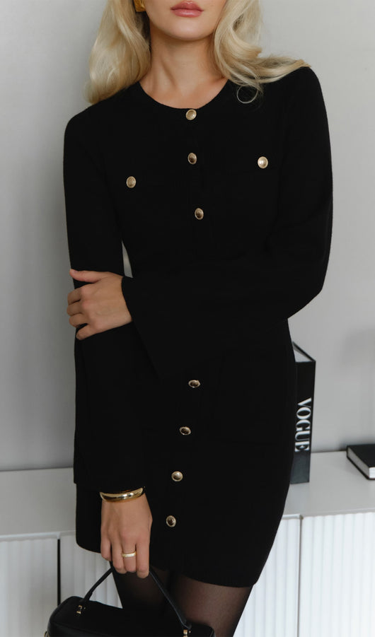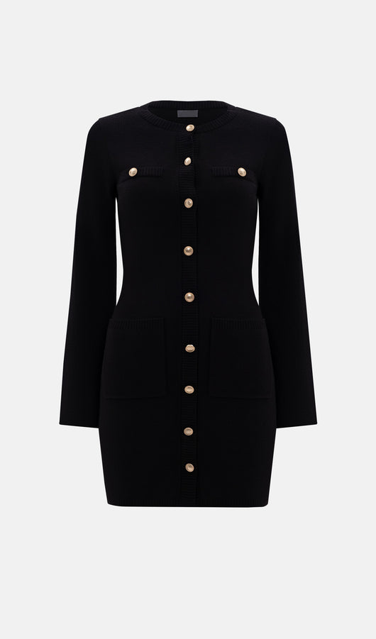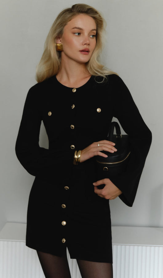 Demure straight mini dress with flared long sleeves, patch side pockets and large golden buttons, made from thick knitted jersey.