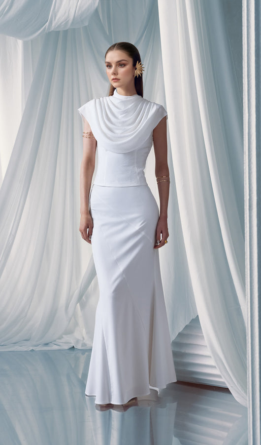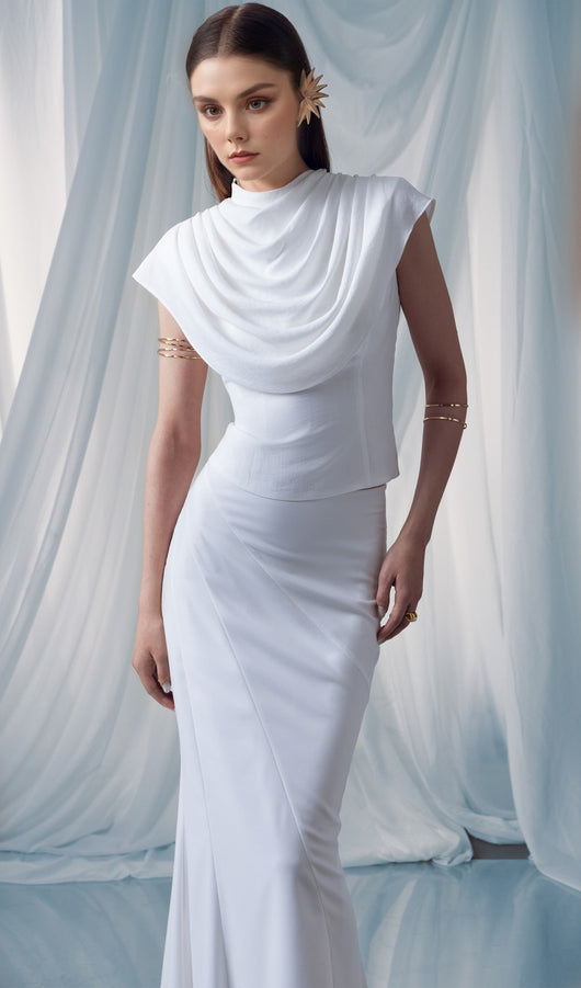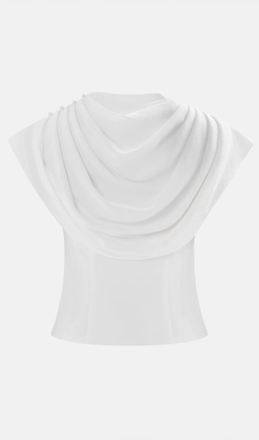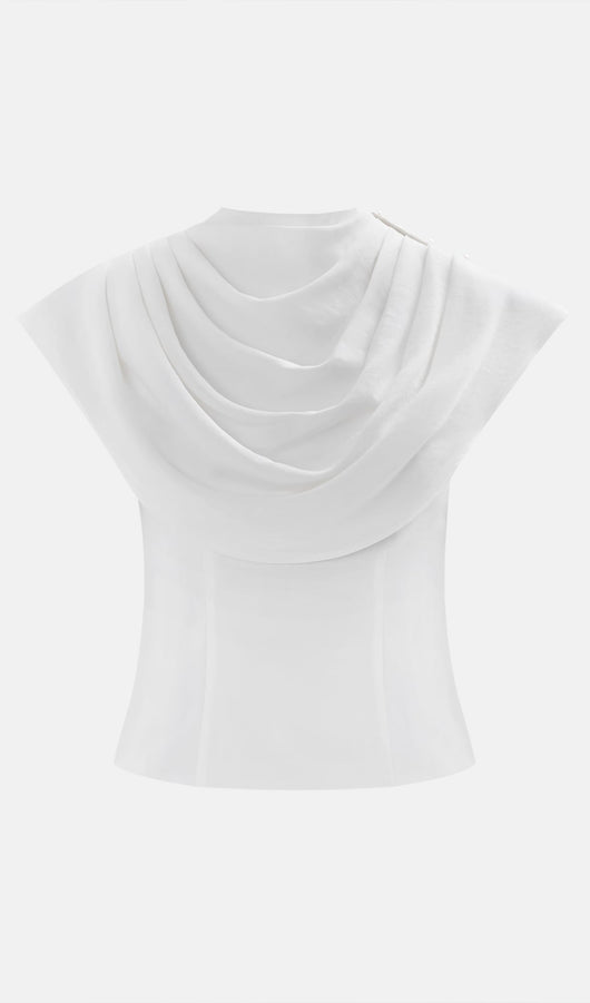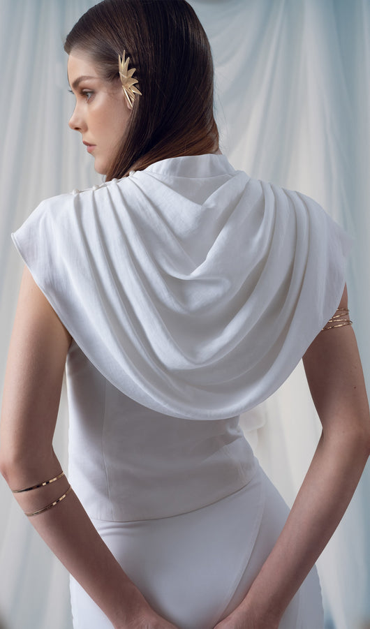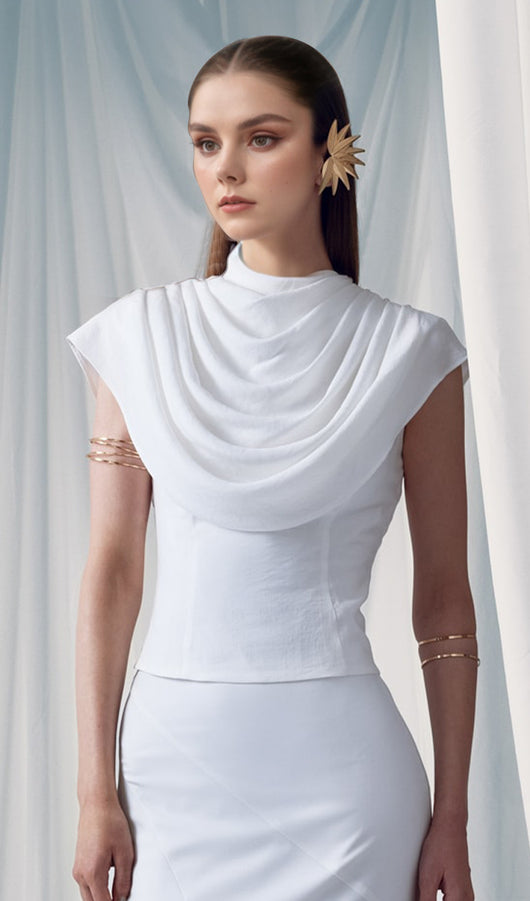 Elegant fitted top with a high collar, delicate raised darts at the waist and deep pleats on the shoulders, forming a spectacular drapery at the front.