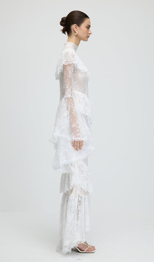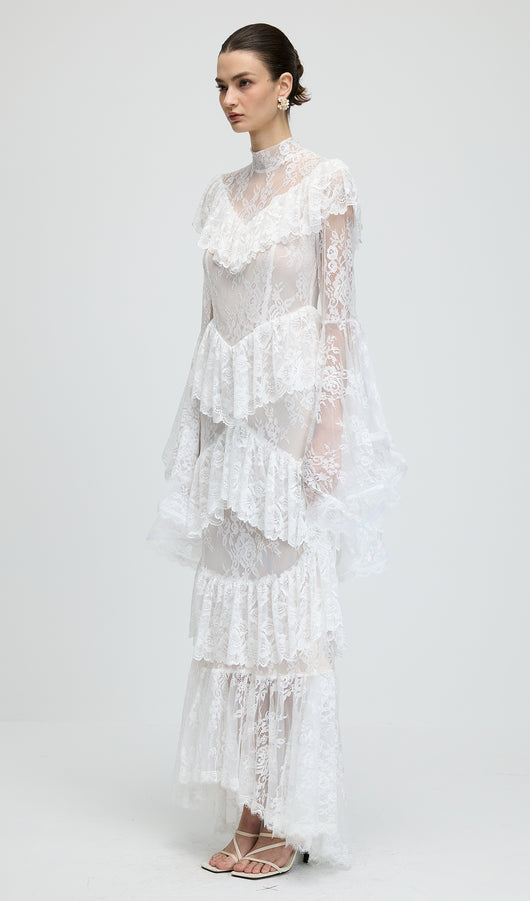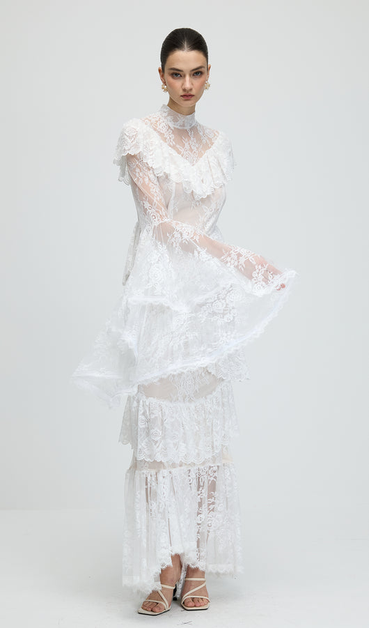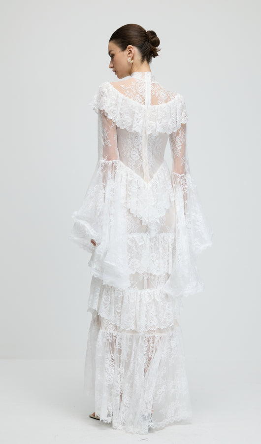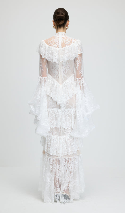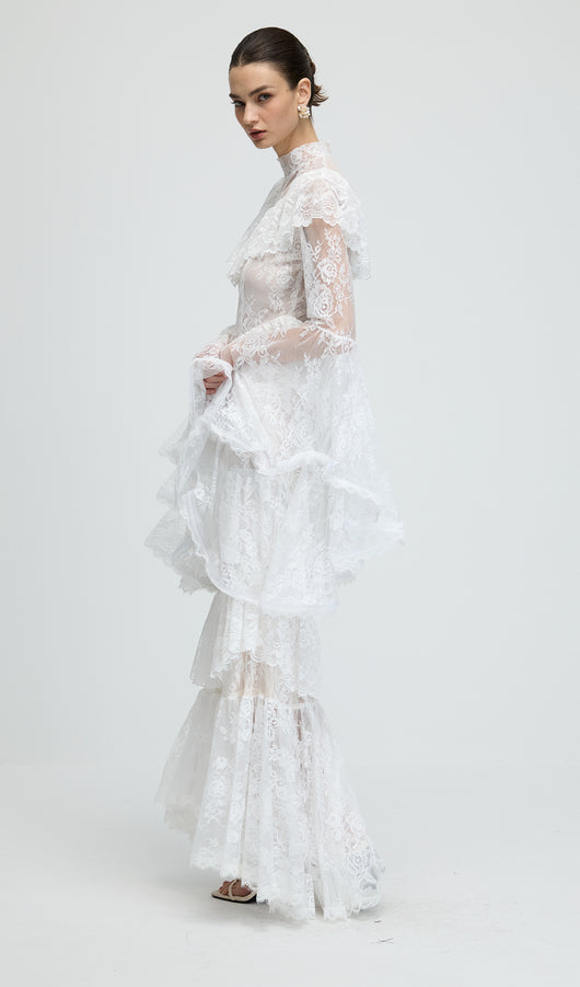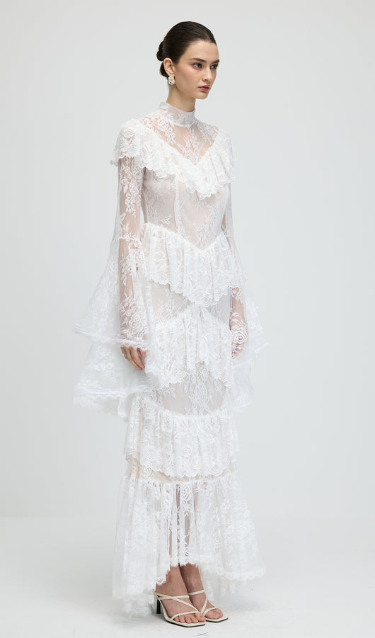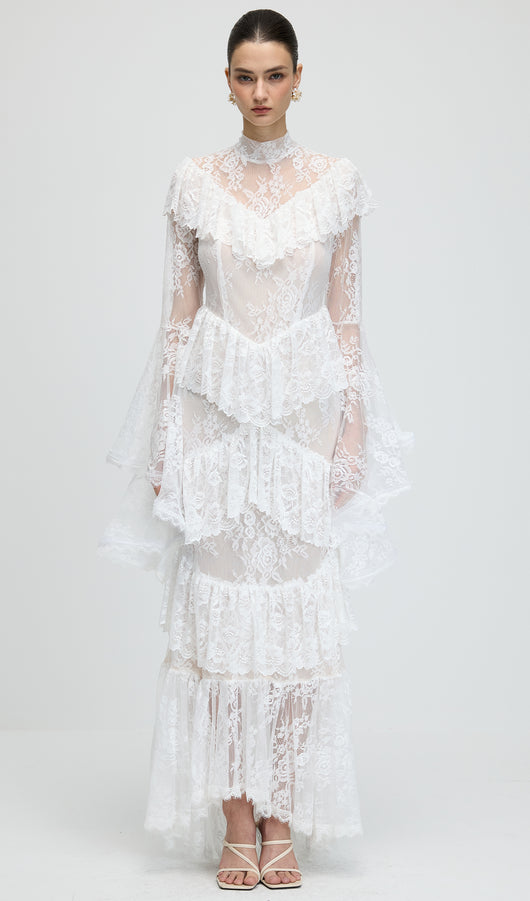 Floral Lace Ruffled Maxi Dress In White