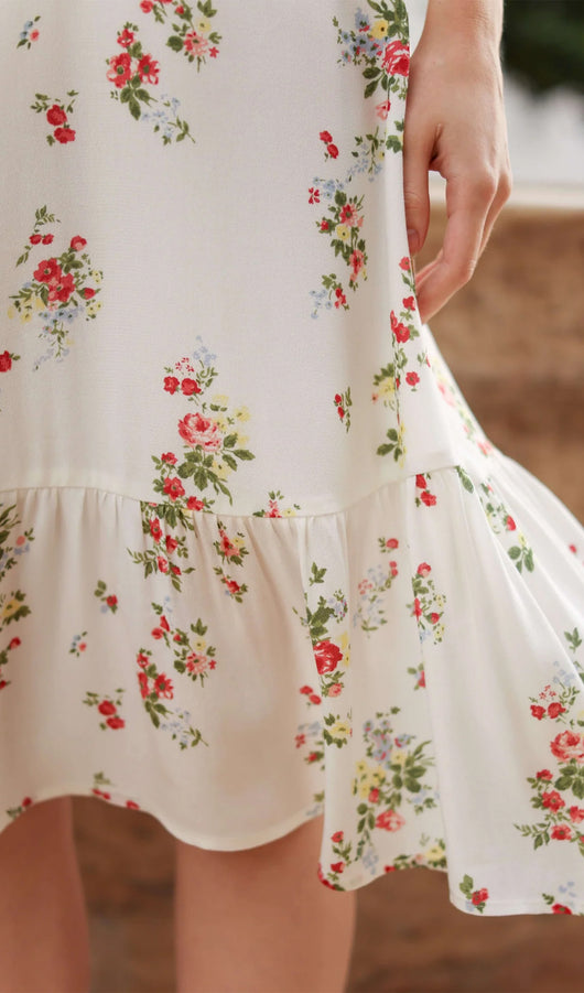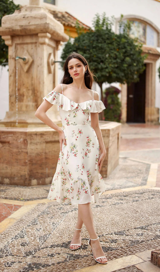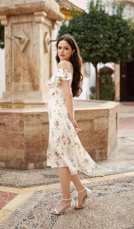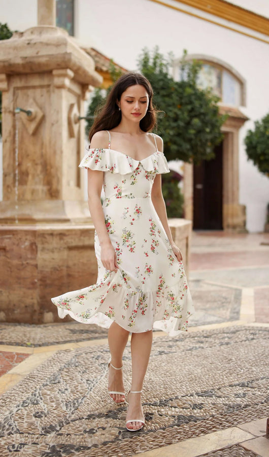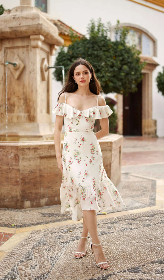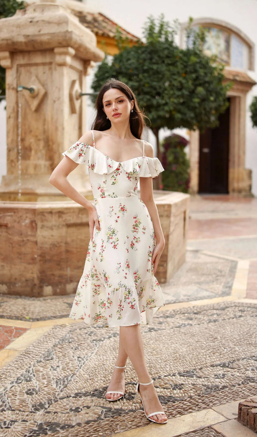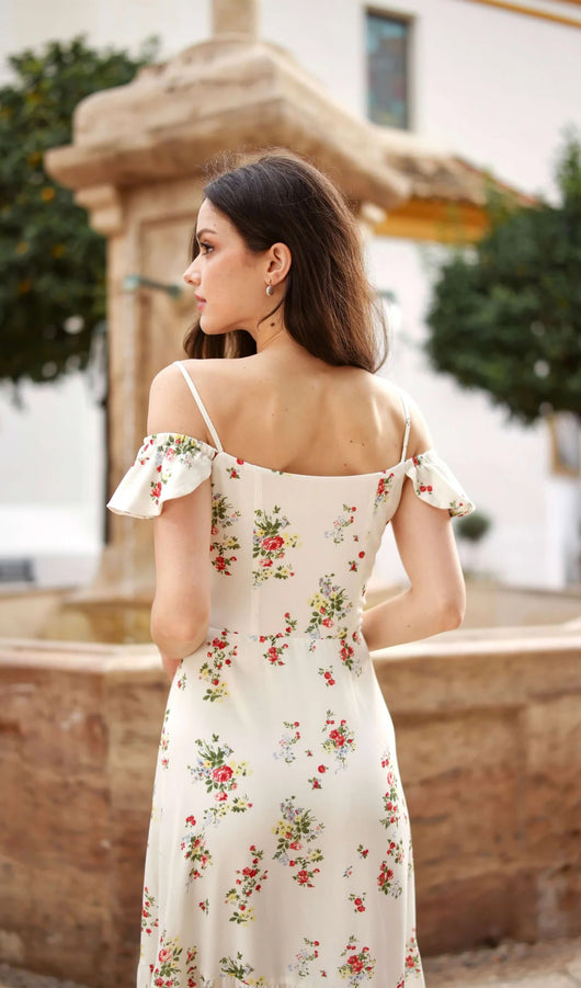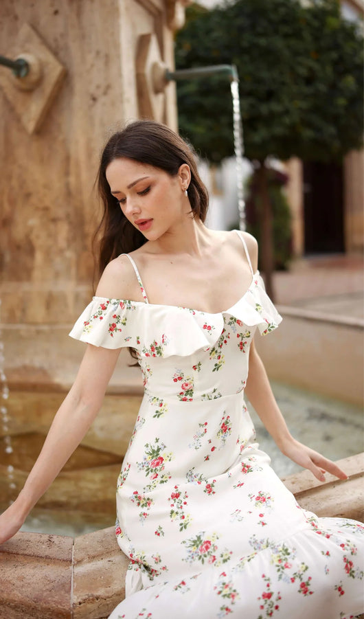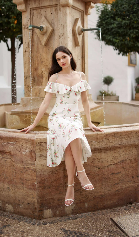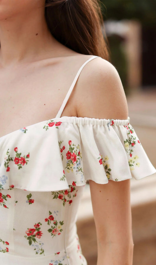 This dress is created from sustainable rayon with an upcycled viscose lining. It features an off-the-shoulder bodice with ruffled detailing and sleeves. The waist tapers and opens to a high-low hemline with layered ruffles for effortless movement.