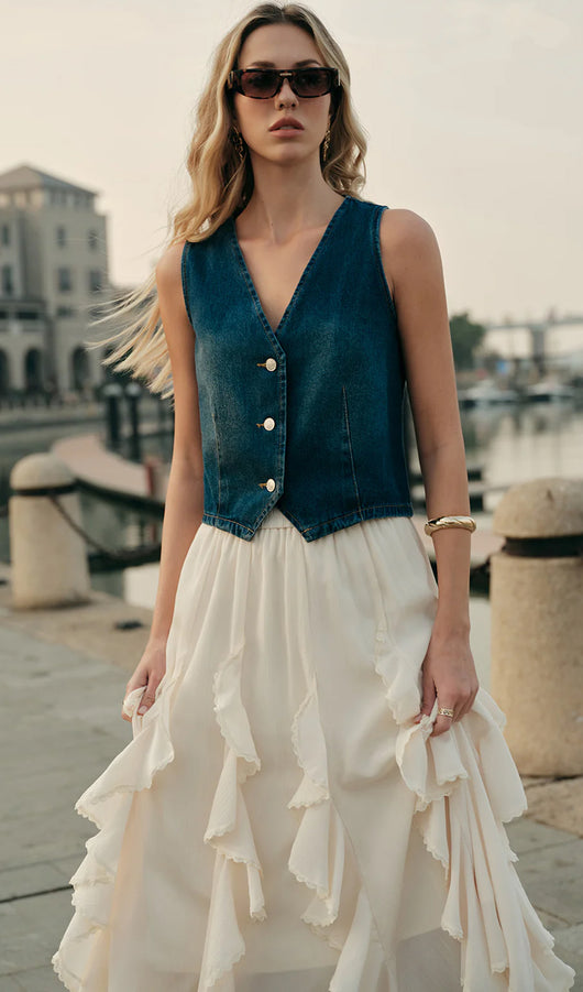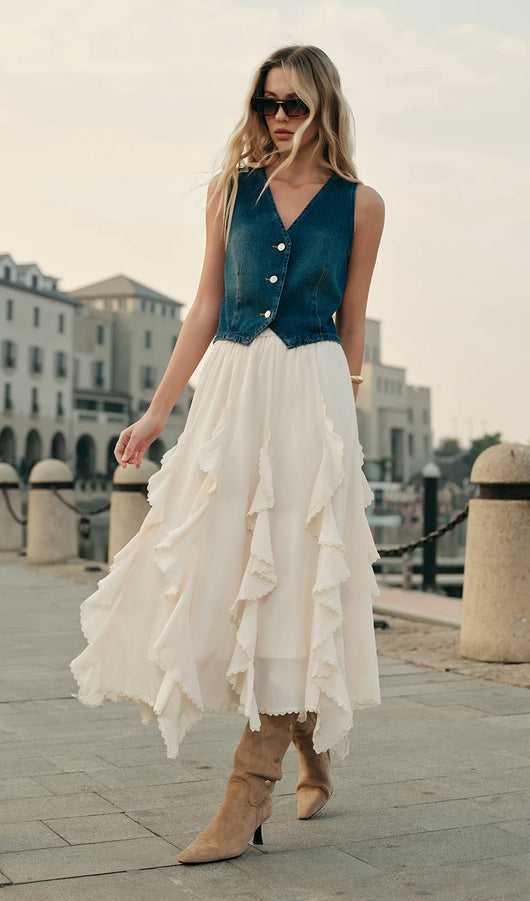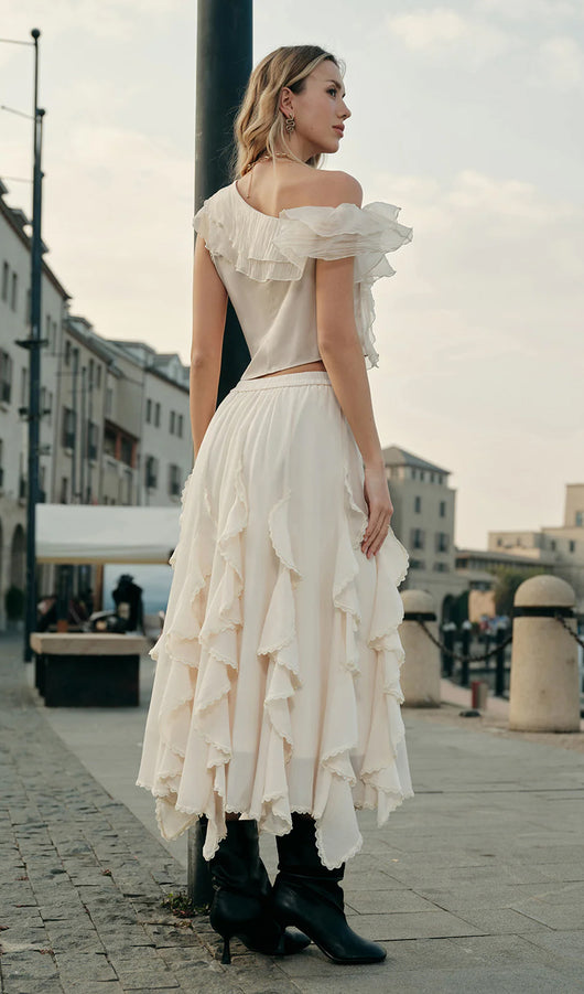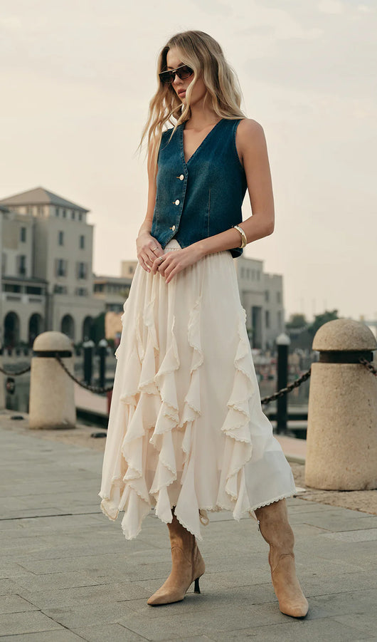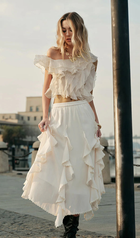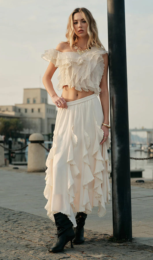 This flowy ruffled midi skirt combines elegant movement with a flattering silhouette. Crafted to drape softly, it features layered ruffles that add texture and dimension, enhancing your outfit with a sophisticated yet playful touch. Ideal for both casual and dressier occasions, this skirt offers versatility and comfort without compromising style.
