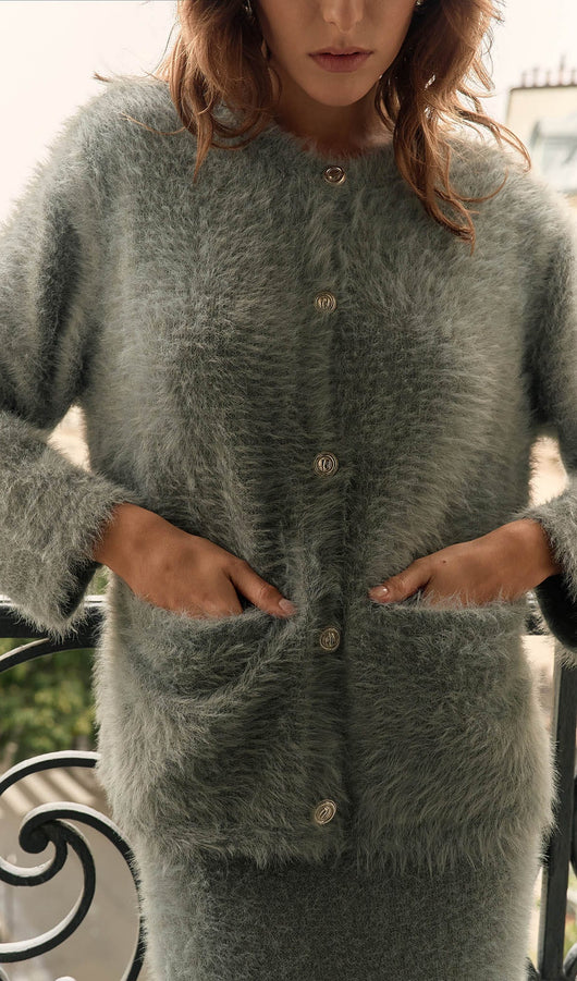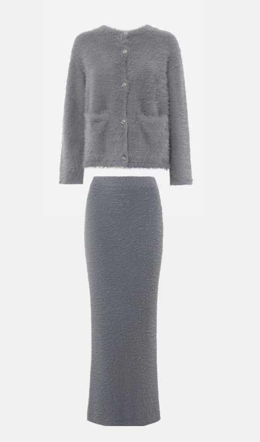 Fluffy Knitted Cardigan & Maxi Skirt Set In Grey