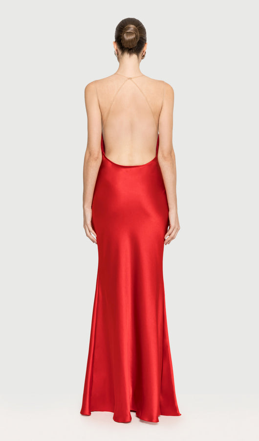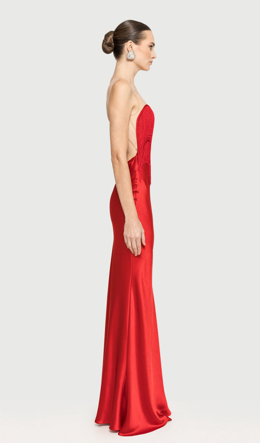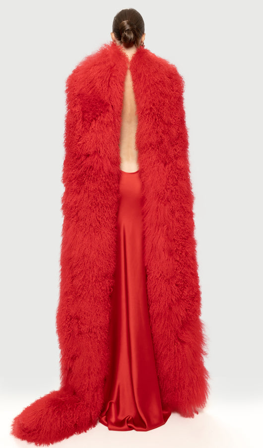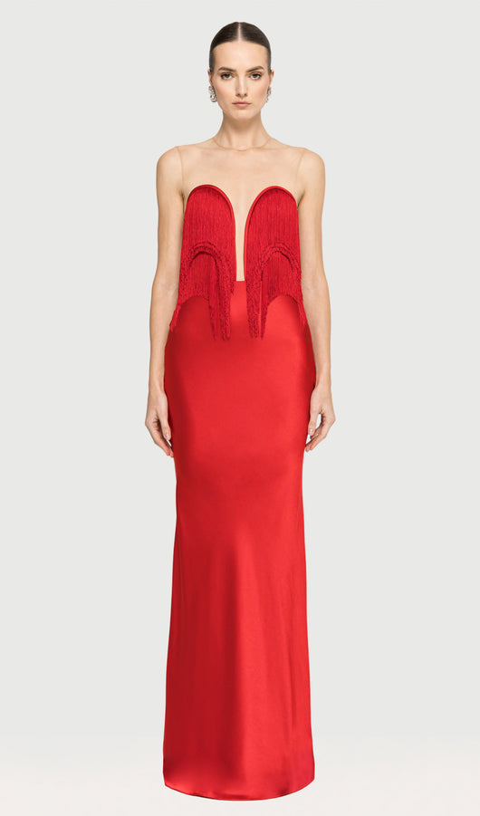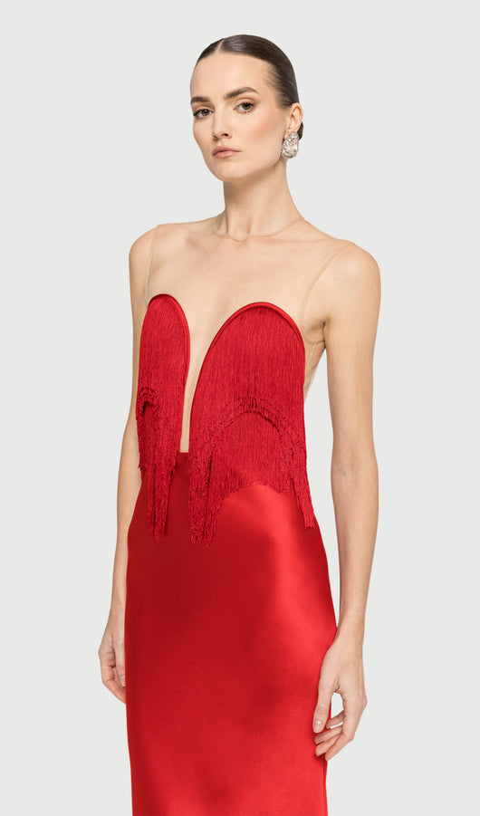 Fringe Detail Satin Maxi Dress With Fur Collar