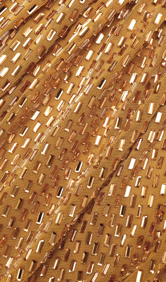 An asymmetric cut-out frames this gold rhinestone midi dress to sultry effect. Gathering ruching sculpts out the waistline above the dynamic flared skirt – add sky-high heels to stay up all night.