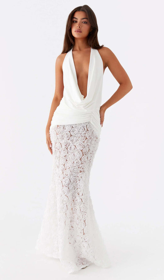 Elevate your evening allure with the Textured Maxi Dress. Featuring a dramatic deep cowl open neckline, ruched panel at the waist, and a captivating open back, it's designed for those who revel in the magic of moonlit nights and twilight's embrace.