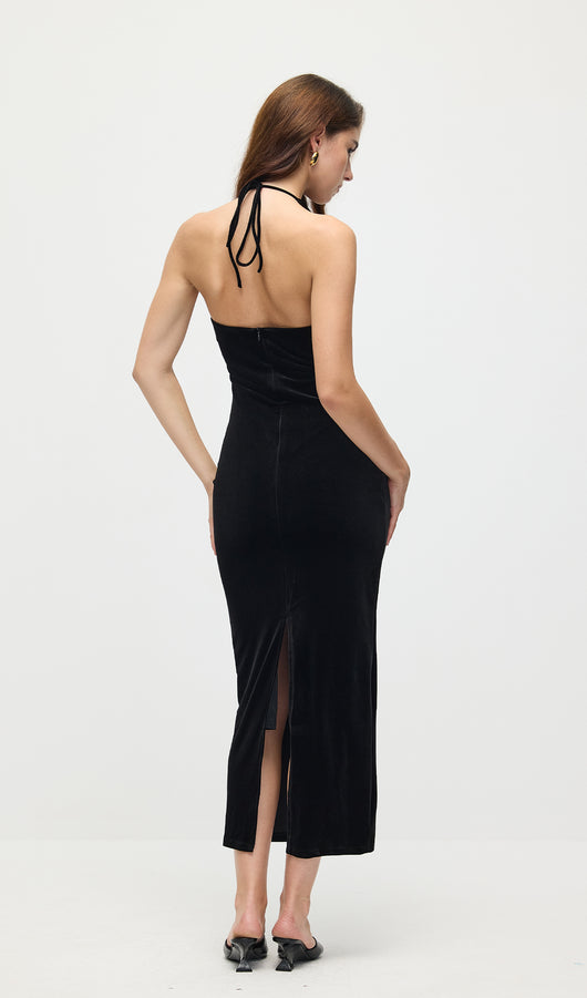 Elevate your evening wardrobe with this sophisticated halter velvet midi dress, expertly crafted for refined occasions. The luxurious velvet fabric drapes beautifully while the halter neckline creates a flattering silhouette that commands attention. Intricate embellishments add dimensional detail and visual interest, transforming this piece into a statement-worthy selection. The midi length strikes an elegant balance between modest and contemporary, making it versatile for cocktail events, formal dinners, or upscale celebrations. Pair with heeled sandals and a structured clutch to complete the polished look.