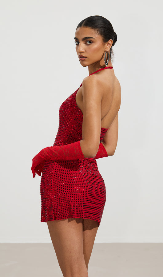 Classic silhouettes with a sparkling twist. Perfect for your next evening event, the mini dress is adorned with scores of signature HOTFIX embellishments that sparkle endlessly under spotlights. It’s crafted from premium 20D stretch mesh to a figure-hugging halterneck silhouette complete with a statement open back.
