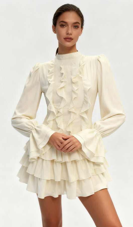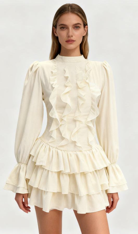 Elevate your evening wardrobe with this sophisticated high neck ruffled mini dress. The structured neckline provides refined support while cascading ruffles add movement and dimension throughout the silhouette. Perfect for cocktail events or upscale casual occasions, this piece balances elegance with contemporary flair. The mini length showcases your legs while maintaining an air of polished sophistication. Versatile enough to transition from day to night, simply pair with heels and minimal accessories to let the dress take center stage.