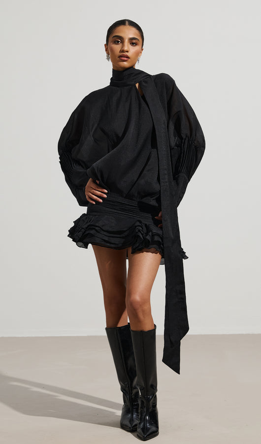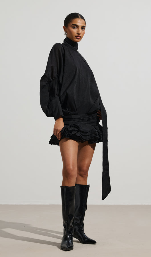 This expertly crafted black High Neck Tiered Mini Dress effortlessly combines style and comfort. With its high neck design and tiered skirt, this dress offers a flattering and fashionable look. Made from high quality materials, this dress is perfect for any occasion, providing both sophistication and ease.