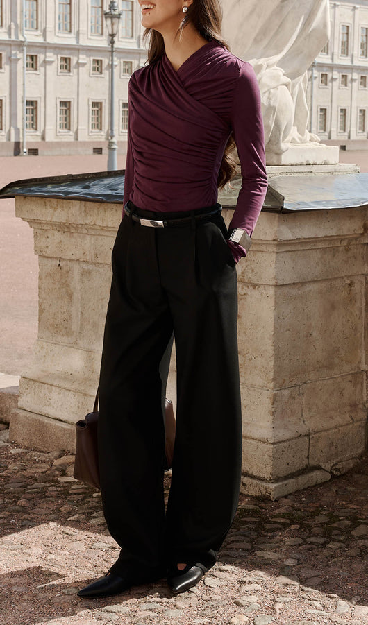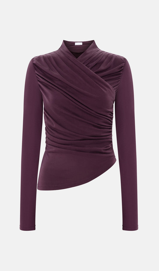 Body-friendly longsleeve made from stretch jersey with wrap imitation on the collar and large pleats on the shoulders, along with fitted long sleeves and small gathers in the side seams.