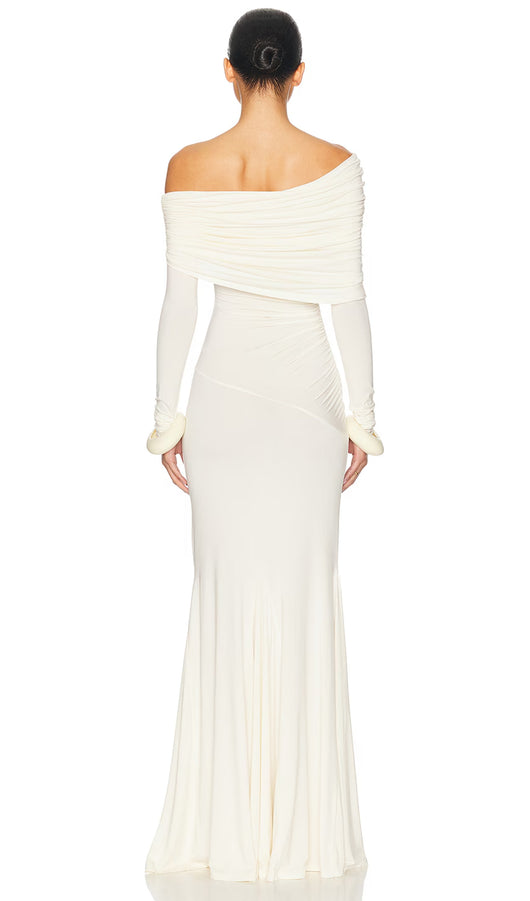 This Jersey Off Shoulder Maxi Dress offers effortless elegance with its pull-on styling and off-shoulder design. Its jersey fabric and ruching detail provide both comfort and a flattering silhouette. Perfect for any occasion, this dress is a must-have for any fashion-forward individual.