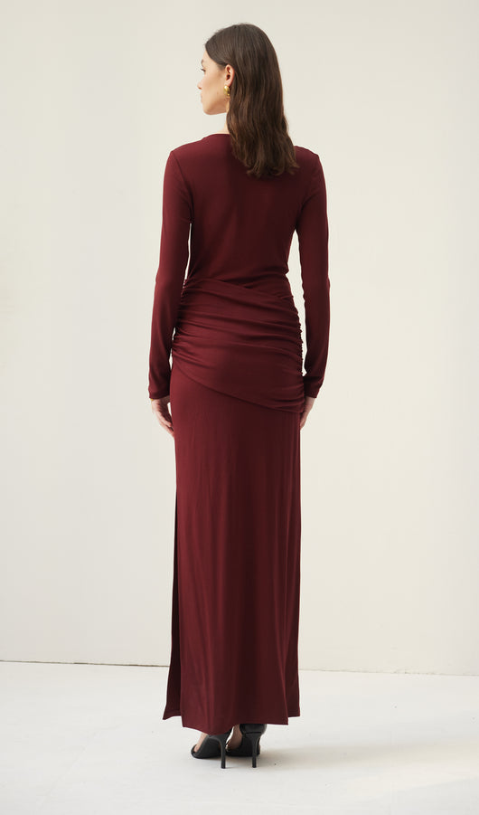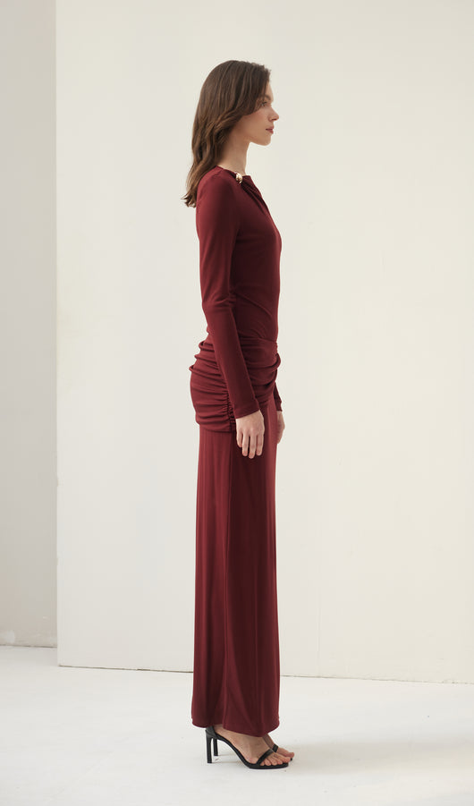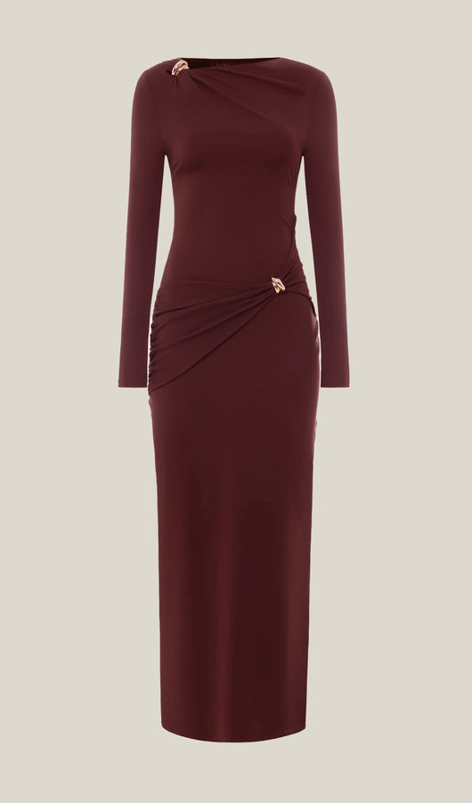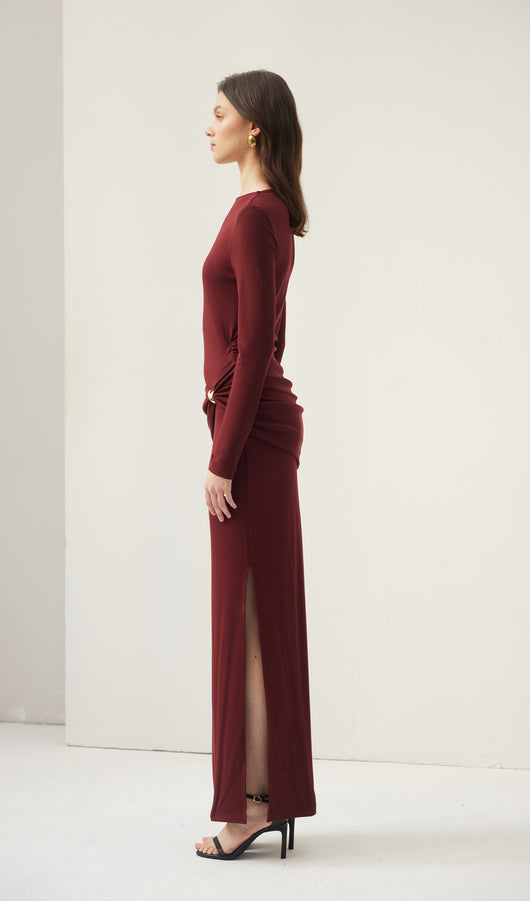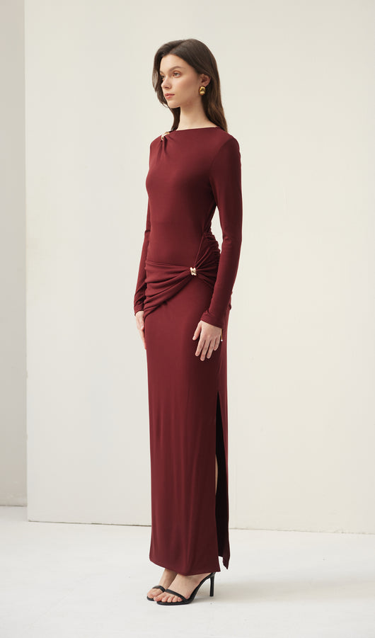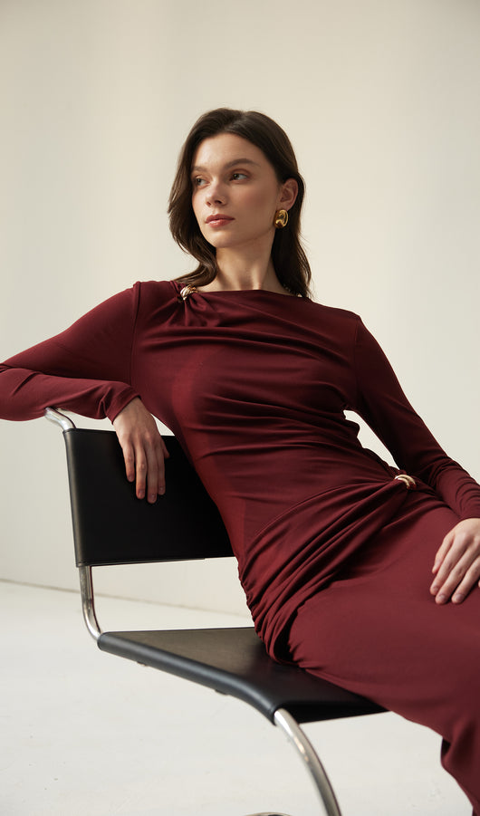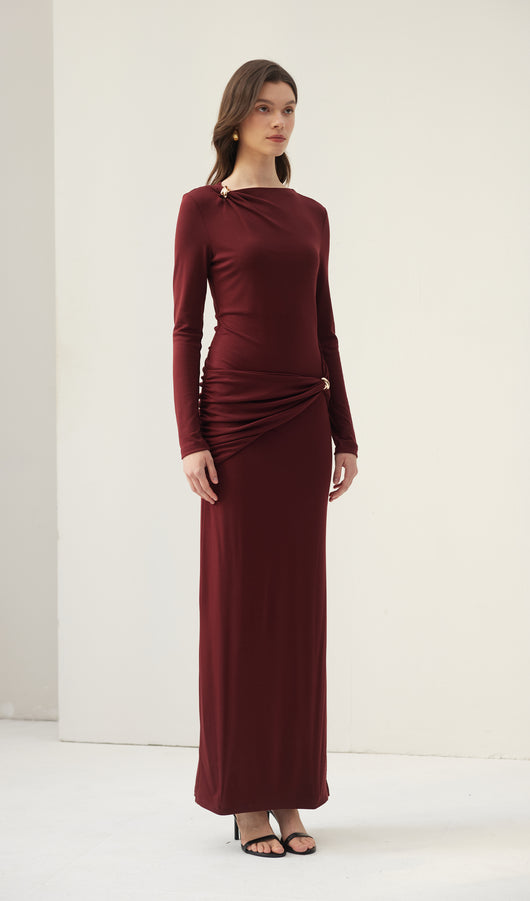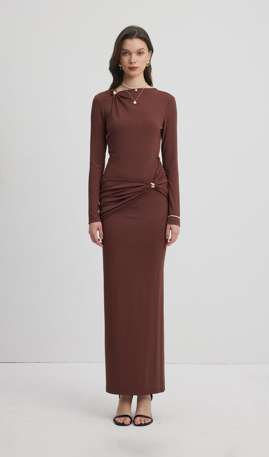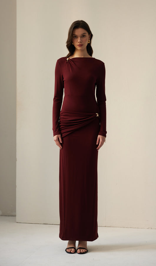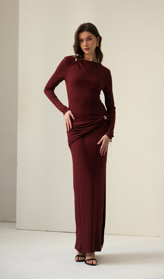 Seductive fitted maxi dress with long sleeves and a straight skirt. The dress is made from stretch jersey and is enhanced with metal decoration on the shoulder and waist, which forms original asymmetric draping and shapes the silhouette.