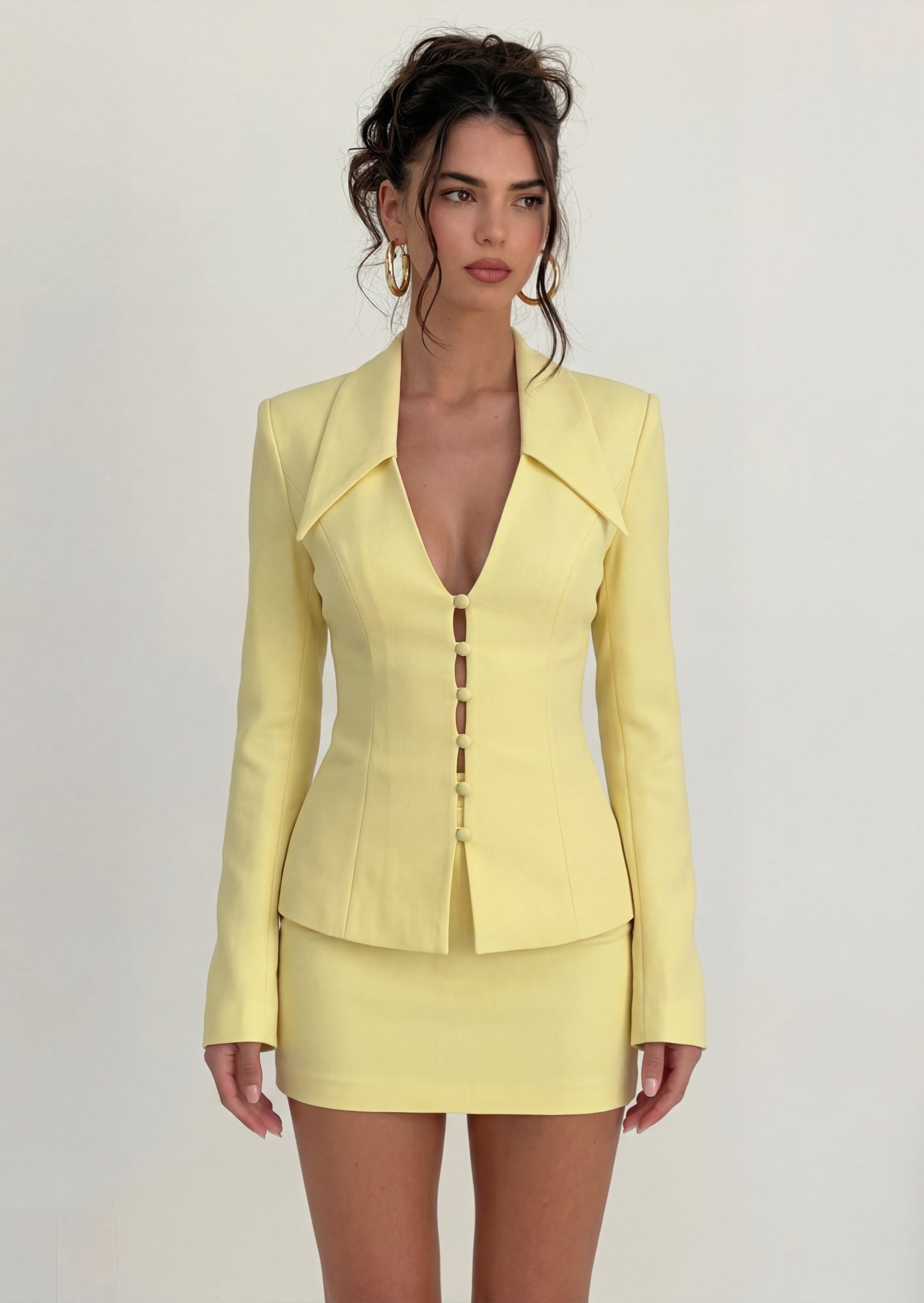 Jovani's signature jacket embodies modern femininity and an architectural silhouette. It creates a striking hourglass shape, accentuating the waist and carefully shaping proportions. A deep V-neck and sculptural collar add drama, while silk covered buttons add a delicate accent.