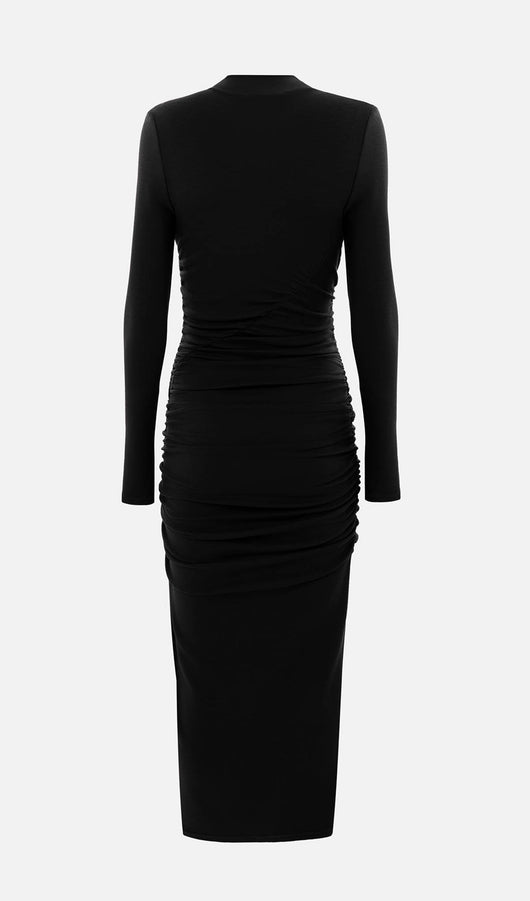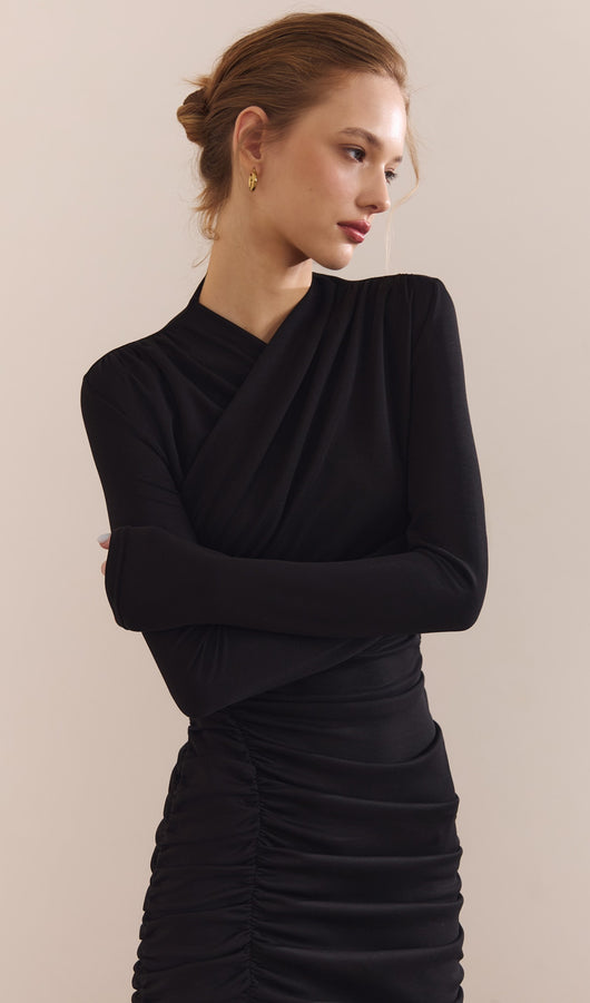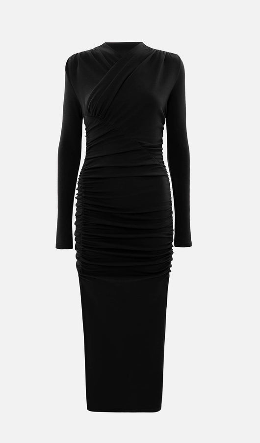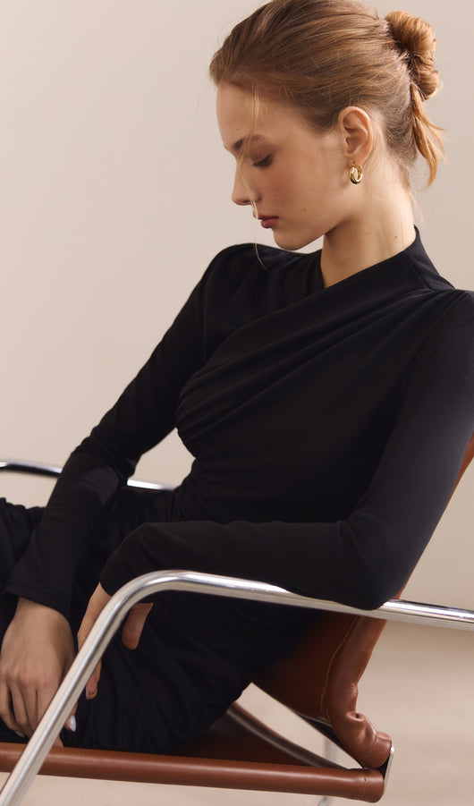 A fitted midi dress with a wrap bodice, fitted long sleeves, and a straight skirt with a side slit. Crafted from thick stretch knit, it features asymmetrical seams with fine gathers.