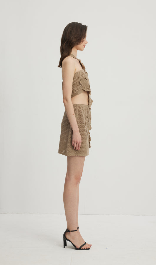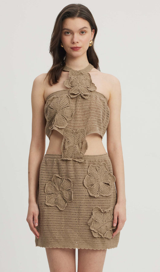 Elevate your style with the enchanting Floral Crochet Mini Dress, a captivating piece that exudes femininity and grace. The functional halter design adds a touch of allure and allows for customisable styling, while the delicate crochet flower appliqué enhances the dress with a romantic and whimsical feel. Unlined for a lightweight and airy fit, this dress is perfect for warm-weather events. The fishtail hem shape adds a dramatic and elegant flair, creating a stunning silhouette that is sure to turn heads. With its mini length, this dress offers a timeless and sophisticated look, making it ideal for special occasions or an elevated everyday ensemble.