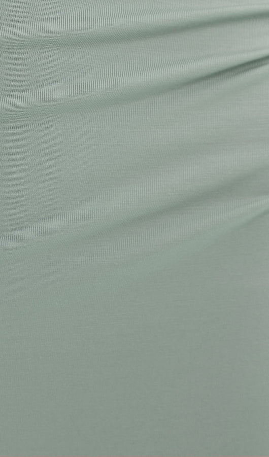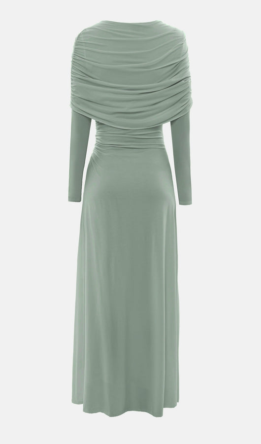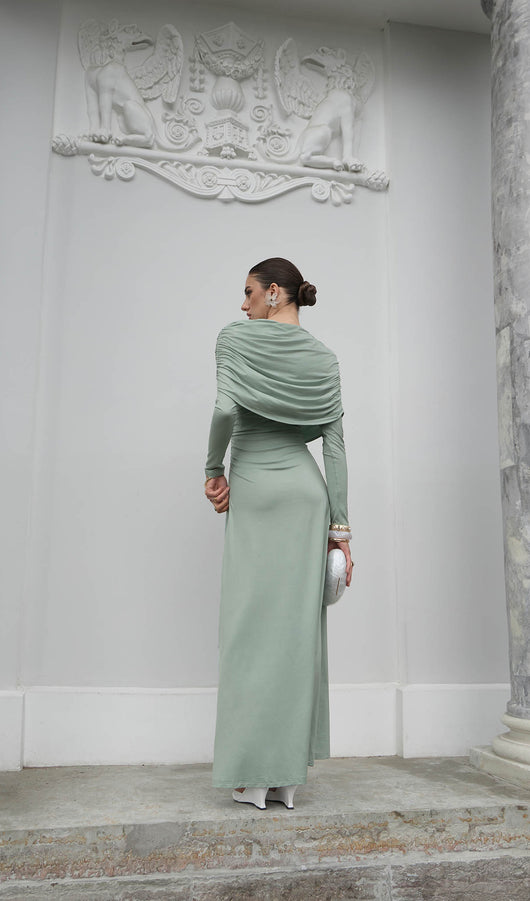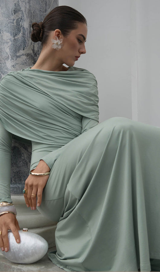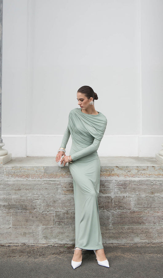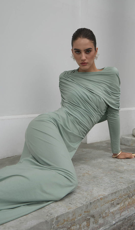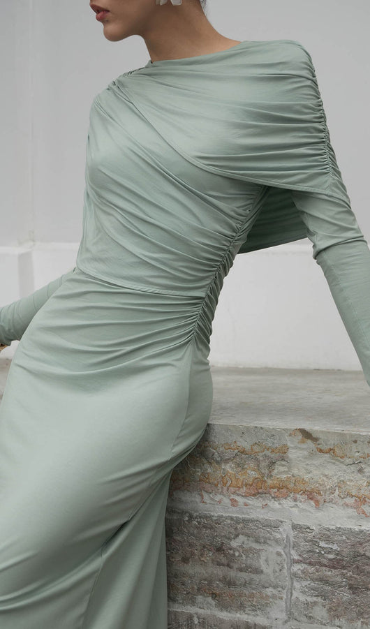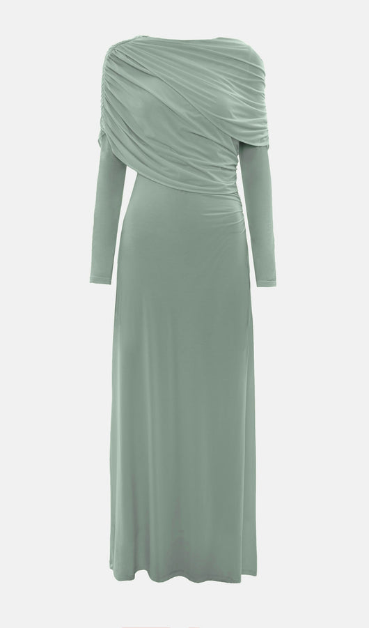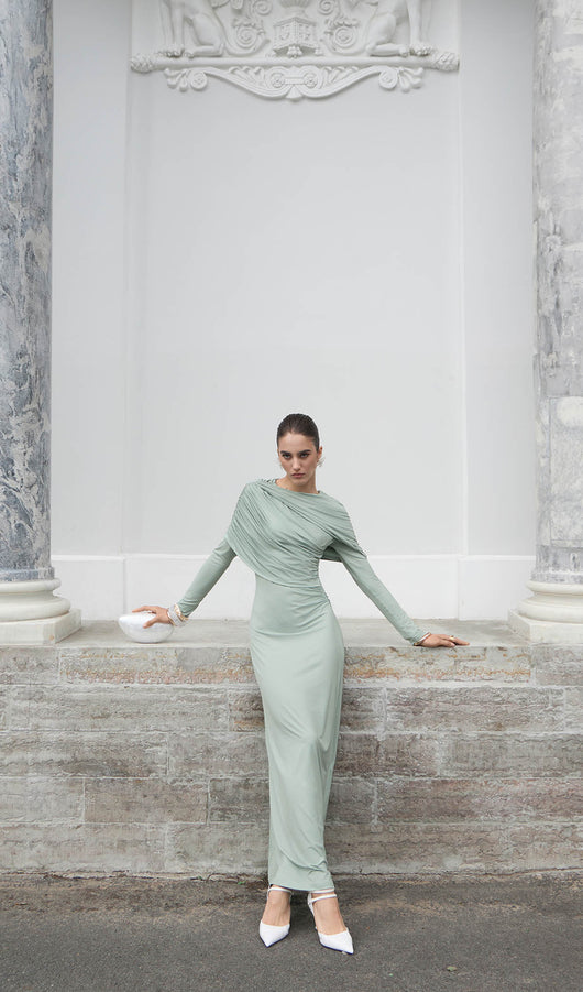 Elegant fitted maxi dress made from body-friendly monochrome jersey. The design features small gatherings in the side seam of the bodice and asymmetric draperies on the shoulders, along with fitted long sleeves and a straight floor-length skirt.